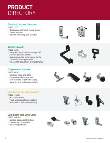Compression LatchesPAGES 86-145 Eliminate noise and rattle Compress gaskets to provide environmental or EMI/RFI sealing Many key and tool access optionsCam Latches & SwinghandlesPAGES 146-187 90˚ Cam rotation Fixed and adjustable grip options Adaptable to multi-point latchingCam Locks and Lock Cores PAGES 188-203 Multiple access control styles Flexible key code options Broad range of sizesElectronic Access SolutionsPAGES 12-55 Concealed, controlled, secure access Vandal resistant Remote monitoring and operationMonitor MountsPAGES 56-85 Integrated positioning technology that provides precision control Maintenance-free performance for the lifetime of most applications No need for adjustment or maintenance*Product Class index on page 629PRODUCT DIRECTORY8
