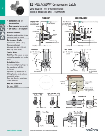92www.southco.com/E36.4 (.25)56 (2.0) 21.5(.87)Ø 28 (1.1) 64 (2.52)29(1.13)22(.88)9 (.35) 6.4 (.25)75°9.5 (.37)19 (.75)33(1.31)Ø 29(1.13)75°18 (.71)Ø 29(1.13)45(1.77)82.5 (3.25) 32.5(1.27)37(1.46)5 (.20)37(1.46)22 (.87)6.4 (.25)29(1.13)40 (1.57)19.1 (.75) Ø 22.5 (.89)DoorFrameACTUAL SIZEDimensions in millimeters (inch) unless otherwise stated• Consistent pre-set compression• Tool operated for security• EN 45545-3 E10 CompliantMaterial and FinishZinc alloy, powder coated or chrome plated and steel, zinc platedPerformance DetailsCompression: 6.4 mm (.25 in)Maximum static load:Adjustable Grip: 450 N (100 lbf)Fixed Grip: 300 N (67lbf)Sealing NotesNEMA 4 and IP65 enabled by using optional flange gasket (part number E5-17)Installation NotesRecommended tightening torque for the mounting nut is 20 N·m(176 in·lbf)Adjustable Grip: Position cam so latching function can be achieved comfortably by hand.Fixed Grip: Mounting screw torque 10 N·m (88 in·lbf)Keys and AccessoriesSee pages 118-121E3 VISE ACTION ® Compression LatchZinc housing · Tool or hand operated Fixed or adjustable grip · 19.1mm sizeFIXED GRIP ADJUSTABLE GRIPT-Handle StyleWing Knob StyleRailway Standard - Bellcore 216Other tool head styles(Slotted recess shown)Knob StyleLock core (shown in unlocked positionCamDoor thickness18 (.76) Max. (doorplus flange gasket)Door thickness18 (.76) Max. (door plus flange gasket)Frame FrameCamMounting ScrewDoor DoorFlange gasket Flange gasketHousing HousingMounting nut Mounting nutIndicators line up when latch is closedCam(open position) Cam(open position)G Grip (measured in G Grip (measured in latched position)latched position)Optional: Roundhole installation with spur washerFixed Grip36 (1.42)Adjustable Grip 24 (06)Latch openType “A” clockwise to latchLatch closedType “A” clockwise to latch