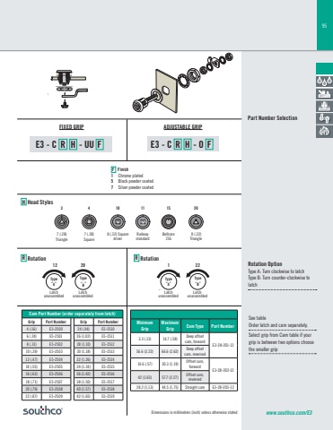 95www.southco.com/E3Type“A”Type“B”Turn clockwiseto latchTurn counter-clockwiseto latchR RotationType“A”Type“B”Turn clockwiseto latchTurn counter-clockwiseto latchDimensions in millimeters (inch) unless otherwise statedSee tableOrder latch and cam separately.Select grip from Cam table if your grip is between two options choose the smaller grip 8 (.32) Triangle8 (.32) Square driverBellcore216Railway standardE3 - C R H - UU F E3 - C R H - O7 (.28)Square7 (.28)TriangleFF Finish1 Chrome plated5 Black powder coated7 Silver powder coatedFIXED GRIP ADJUSTABLE GRIPRotation OptionType A: Turn clockwise to latchType B: Turn counter-clockwise to latchMinimum GripMaximum Grip Cam Type Part Number3.3 (.13) 14.7 (.58) Deep offset cam, forward E3-28-201-1256.6 (2.23) 66.6 (2.62) Deep offset cam, reversed14.6 (.57) 30.3 (1.19) Offset cam, forwardE3-28-202-1242 (1.65) 57.7 (2.27) Offset cam, reversed28.2 (1.13) 44.5 (1.75) Straight cam E3-28-203-12Cam Part Number (order separately from latch)Grip Part Number Grip Part Number4 (.16) E5-2500 24 (.94) E5-25106 (.24) E5-2501 26 (1.02) E5-25118 (.31) E5-2502 28 (1.10) E5-251210 (.39) E5-2503 30 (1.18) E5-251312 (.47) E5-2504 32 (1.26) E5-251414 (.55) E5-2505 34 (1.34) E5-251516 (.63) E5-2506 36 (1.42) E5-251618 (.71) E5-2507 38 (1.50) E5-251720 (.79) E5-2508 40 (1.57) E5-251822 (.87) E5-2509 42 (1.65) E5-2519122029 1 22Latchunassembled15LatchunassembledLatchunassembledLatchunassembled3 4 10 11H Head StylesR RotationPart Number Selection