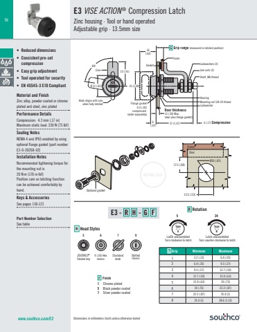 96ACTUAL SIZELatch unassembledTurn counter-clockwise to latchLatch unassembledTurn clockwise to latchwww.southco.com/E3CamKnob aligns with camwhen fully latched16(.62)23 (.91)25 (1.00)8006(.23)Ø 21 (.81)Mounting nut 5/8-24 thread LockwasherHousingLockwashers (2)Jam nuts (2)Shaft, M6 threadFrame37 (1.47) 4 (.17) CompressionDoor thickness13 (.50) Max. (door plus flange gasket)(measured in latched position)GasketFlange gasket0.4 (.02)compressed (order separately)Optional gasketType“A”Type“B”Turn clockwiseto latchTurn counter-clockwiseto latchType“A”Type“B”Turn clockwiseto latchTurn counter-clockwiseto latch17.5 (.69)DoorFrameØ16 (.63)13.5 (.53)Dimensions in millimeters (inch) unless otherwise stated• Reduced dimensions• Consistent pre-set compression• Easy grip adjustment• Tool operated for security• EN 45545-3 E10 CompliantMaterial and FinishZinc alloy, powder coated or chrome plated and steel, zinc platedPerformance DetailsCompression: 4.3 mm (.17 in) Maximum static load: 330 N (75 lbf)Sealing NotesNEMA 4 and IP65 enabled by using optional flange gasket (part number E3-0-30268-02)Installation Notes Recommended tightening torque for the mounting nut is20 N·m (176 in·lbf)Position cam so latching function can be achieved comfortably by hand.Keys & AccessoriesSee pages 118-121E3 VISE ACTION ® Compression LatchZinc housing · Tool or hand operated Adjustable grip · 13.5mm sizeE3 - R H - G FG Grip Minimum Maximum1 3.2 (.13) 6.4 (.25)2 6.4 (.25) 9.5 (.37)3 9.5 (.37) 12.7 (.50)4 12.7 (.50) 15.9 (.63)5 15.9 (.63) 19 (.75)6 19 (.75) 22.2 (.87)7 22.2 (.87) 25.4 (1)8 25.4 (1) 28.6 (1.13)F Finish1 Chrome plated5 Black powder coated 7 Silver powder coatedH Head StylesR RotationPart Number SelectionSee table5 24SOUTHCO®Tubular key54 (.16) Hexrecess6Standard knob7Slotted recess9