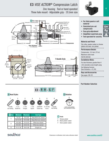 97ACTUAL SIZEACTUAL SIZEwww.southco.com/E3Cam inopenposition33(1.31)22(.88)40 (1.56) 11(.42)DoorGasketFrame60 (2.35)M4 x 0.7 screws (supplied)Cam6.4 (.25) CompressionM10 lock nuts (2)Lockwasher (2)Deep offset cam reversedStraight camOffset camreversedWeatherseal0.8 (.03) (measured in latched position)Door thickness4 (.16) Maximum750FrameDOORØ 20±2.5(.78±.01) 1 HoleØ 4.8±0.1 (.19±.005)2 Holes16±0.1(.62±.005)16±0.1(.62±.005)24±1.5(.94±.06)Door22(.88)11(.42)Door82.5 (3.25)25(.98)Type“A”Type“B”Turn clockwiseto latchTurn counter-clockwiseto latchDimensions in millimeters (inch) unless otherwise stated• For thick panel or soft material• Consistent pre-set compression• Easy grip adjustment• Simplified round hole prep• Tool operated for securityMaterial and FinishZinc alloy, powder coated or chrome plated and steel, zinc platedPerformance DetailsCompression: 6.4 mm (.25 in) Maximum static load: 450 N (100 lbf)Installation NotesFor door thickness greater than 4 (.16) calculate screw length using the following formula:Door thickness + 6 (.24)Keys and AccessoriesSee pages 118-121E3 VISE ACTION ® Compression LatchZinc housing · Tool or hand operatedThree hole mount · Adjustable grip · 19.1mm sizeG Grip Minimum Maximum Cam Type1 7.9 (.31) 23.6 (.93) Deep offset cam, forward 62.7 (2.47) 76.2 (3.00) Deep offset cam, reversed 2 21.8 (.86) 37.3 (1.47) Offset cam, forward 49 (1.93) 64.8 (2.55) Offset cam, reversed 3 35.3 (1.39) 50.8 (2.00) Straight camE3 - R H - G FF Finish1 Chrome plated5 Black powder coated7 Silver powder coatedT-Handle Style7 (.28)Triangle3T-handle, non-locking17 (.28)Square43 (.11)Double bit2SOUTHCO®Tubular key58 (.32) Hexrecess6T-handle, key-locking8 3R RotationLatch unassembledTurn clockwise to latchH Head StylesPart Number Selection