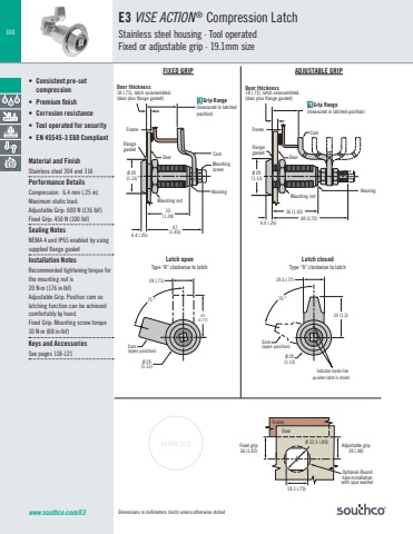 100ACTUAL SIZEwww.southco.com/E36.4 (.25)69 (2.72)36 (1.42)75 ° 75 °Ø 29 (1.13) 19.5 (.77)33 (1.3)Indicator marks line up when latch is closed35(1.38)47(1.85) 6.4 (.25)Cam(open position)18 (.71)45(1.77)Ø 29(1.13) Ø 29 (1.13) Ø 29 (1.13)Cam(open position)19.1 (.75) Ø 22.5 (.89)Optional: Roundhole installation with spur washerFixed grip36 (1.42)Adjustable grip24 (.94)DoorFrameDimensions in millimeters (inch) unless otherwise stated• Consistent pre-set compression• Premium finish• Corrosion resistance• Tool operated for security• EN 45545-3 E60 CompliantMaterial and FinishStainless steel 304 and 316Performance DetailsCompression: 6.4 mm (.25 in) Maximum static load:Adjustable Grip: 600 N (136 lbf)Fixed Grip: 450 N (100 lbf)Sealing NotesNEMA 4 and IP65 enabled by using supplied flange gasketInstallation NotesRecommended tightening torque for the mounting nut is 20 N·m (176 in·lbf)Adjustable Grip: Position cam so latching function can be achieved comfortably by hand.Fixed Grip: Mounting screw torque 10 N·m (88 in·lbf)Keys and AccessoriesSee pages 118-121E3 VISE ACTION ® Compression LatchStainless steel housing · Tool operatedFixed or adjustable grip · 19.1mm sizeFIXED GRIP ADJUSTABLE GRIPLatch openType “A” clockwise to latchLatch closedType “A” clockwise to latchDoor thickness18 (.71), latch unassembled. (door plus flange gasket)Door thickness18 (.71), latch unassembled. (door plus flange gasket)Flange gasket DoorCam FrameHousingMounting nutFlange gasketDoor CamFrameMounting screwHousingMounting nutG Grip Range(measured in latched position)G Grip Range(measured in latched position)