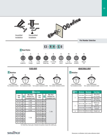 101Dimensions in millimeters (inch) unless otherwise statedG Grip TableTotal Grip GMax. Door Thickness for Assembled LatchTotal Grip GMax. Door Thickness for Assembled Latch20 (.79) 00 1 (.04) 40 (1.57) 107 (.28)22 (.87) 01 2 (.08) 42 (1.65) 1124 (.94) 02 4 (.16) 44 (1.73) 1226 (1.02) 03 5 (.20) 46 (1.81) 1328 (1.10) 04 6 (.24) 48 (1.89) 1430 (1.18) 057 (.28)50 (1.97) 1532 (1.26) 06 52 (2.05) 1634 (1.34) 07 54 (2.13) 1736 (1.42) 08 56 (2.20) 1838 (1.50) 09 58 (2.28) 19H Head StylesAssembled InstallationUnassembled InstallationE3 - R H - G OG Grip Minimum Maximum Cam Type116.4 (.64) 32.2 (1.26) Deep offset cam, forward71.3 (2.80) 81.2 (3.19) Deep offset cam, reversed230.4 (1.19) 46.1 (1.81) Offset cam, forward57.6 (2.26) 73.3 (2.88) Offset cam, reversed3 43.9 (1.72) 59.6 (2.34) Straight cam7 (.28)Triangle37 (.28)Square43 (.11)Double bit2SOUTHCO®Tubular key58 (.32) Hexrecess68 (.32) Square driver10Slotted recess9Railway standard11Bellcore21615R RotationType“B”Type“A”Type“B”Type“A”Type“B”Type“A”10 12 27 29 1 22Latch assembledTurn clockwise to latchLatch unassembledTurn counter-clockwise to latchLatch unassembledTurn clockwise to latchLatch assembledTurn counter-clockwise to latchLatch unassembledTurn counter-clockwise to latchLatch unassembledTurn clockwise to latchR RotationFor Fixed Grip, if your grip is between two options choose the smaller gripFIXED GRIP ADJUSTABLE GRIPPart Number Selection