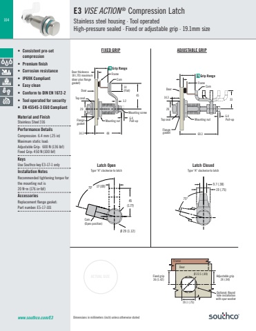 104www.southco.com/E36.43.21414.3199.714.3 454875°6.469.33329 29Ø 296.4 (.25)3.2 (.13)14 (.55)14.3(.58)19 (.75)9.7 (.38)14.3(.58)45(1.77)48(1.84)75°6.4 (.25)69.3(2.73)33(1.30)19 (.75)9.7 (.38)75°Ø 29 (1.12)17 (.69)45(1.77)75ºACTUAL SIZE19.1 (.75) Ø 22.5 (.89)Optional: Roundhole installation with spur washerFixed grip36 (1.42)Adjustable grip24 (.94)DoorFrameDimensions in millimeters (inch) unless otherwise statedG Grip RangeG Grip RangeFIXED GRIP ADJUSTABLE GRIPFlangegasketFlangegasketTop sealTop sealFrameFrameCamDoor DoorMounting nut Mounting nut Pull-up(Flat)Pull-up• Consistent pre-set compression• Premium finish• Corrosion resistance• IP69K Compliant• Easy clean• Conform to DIN EN 1672-2• Tool operated for security• EN 45545-3 E60 CompliantMaterial and FinishStainless Steel 316Performance DetailsCompression: 6.4 mm (.25 in)Maximum static load:Adjustable Grip: 600 N (136 lbf)Fixed Grip: 450 N (100 lbf)KeysUse Southco key E3-17-1 onlyInstallation NotesRecommended tightening torque for the mounting nut is20 Nm (176 inlbf)AccessoriesReplacement flange gasket:Part number: E5-17-101E3 VISE ACTION ® Compression LatchStainless steel housing · Tool operated High-pressure sealed · Fixed or adjustable grip · 19.1mm sizeLatch OpenType “A” clockwise to latchLatch ClosedType “A” clockwise to latchCamCam(Open position)Mounting screwDoor thickness18 (.70) maximum(door plus flange gasket)