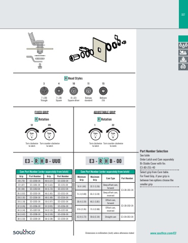 107Turn clockwiseto latchTurn counter-clockwiseto latchType“B”Type“A”Turn clockwiseto latchTurn counter-clockwiseto latchType“B”Type“A”FIXED GRIP ADJUSTABLE GRIPCam Part Number (order separately from latch)Minimum GripMaximum Grip Cam Type Part Number16.4 (.64) 32.2 (1.26) Deep offset cam, forwardE3-28-201-2471.3 (2.80) 81.2 (3.19) Deep offset cam, reversed30.4 (1.19) 46.1 (1.81) Offset cam, forwardE3-28-202-2457.6 (2.26) 73.3 (2.88) Offset cam, reversed43.9 (1.72) 59.6 (2.34) Straight cam E3-28-203-24Cam Part Number (order separately from latch)Grip Part Number Grip Part Number20 (.79) E5-1200-24 40 (1.57) E5-1210-2422 (.87) E5-1201-24 42 (1.65) E5-1211-2424 (.94) E5-1202-24 44 (1.73) E5-1212-2426 (1.02) E5-1203-24 46 (1.81) E5-1213-2428 (1.10) E5-1204-24 48 (1.89) E5-1214-2430 (1.18) E5-1205-24 50 (1.97) E5-1215-2432 (1.26) E5-1206-24 52 (2.05) E5-1216-2434 (1.34) E5-1207-24 54 (2.13) E5-1217-2436 (1.42) E5-1208-24 56 (2.20) E5-1218-2438 (1.50) E5-1209-24 58 (2.28) E5-1219-24Part Number SelectionSee tableOrder Latch and Cam separatelyBi-Stable Cover with fin:E3-80-251-40Select grip from Cam table.For Fixed Grip, if your grip is between two options choose the smaller gripR RotationØ22.5 (.86) 19.1 (.75)R RotationH Head StylesDimensions in millimeters (inch) unless otherwise stated www.southco.com/E3E3 - R H B - UU0 E3 - R H B - 0012 29 1 227 (.28)Triangle37 (.28)Square48 (.32) Square driver10Railway standard11Bellcore21615