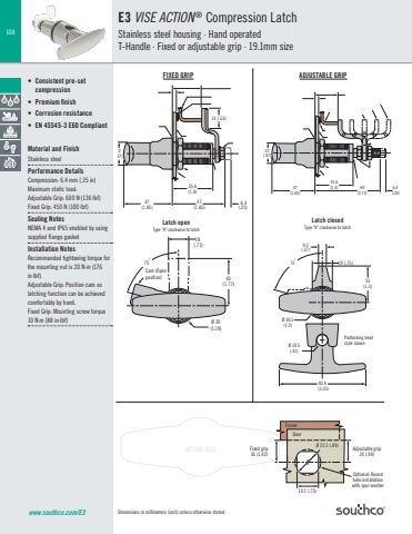 108www.southco.com/E3ACTUAL SIZE19.1 (.75) Ø 22.5 (.89)Optional: Roundhole installation with spur washerFixed grip36 (1.42)Adjustable grip24 (.94)DoorFrameDimensions in millimeters (inch) unless otherwise stated82.6 (3.25)69(2.72)6.4 (.25)35.647 (1.4)(1.85)75˚ 19 (.75)22(.87)33(1.3)9.5(.37)Ø 10.5 (.41) Ø 30.5 (1.2) 14 (.55)35.6(1.4)6.4 (.25) 47(1.85)47(1.85)75˚82.6(3.25)Ø 10.5 (.41) 18 (.71)22(.87)45(1.77)Ø 30.5 (1.2) 82.6 (3.25)69(2.72)6.4 (.25)35.647 (1.4)(1.85)75˚ 19 (.75)22(.87)33(1.3)9.5(.37)Ø 10.5 (.41) Ø 30.5 (1.2) 75˚18 (.71)45(1.77)Ø 30 (1.19) Padlocking head style shownType \• Consistent pre-set compression• Premium finish• Corrosion resistance• EN 45545-3 E60 CompliantMaterial and FinishStainless steelPerformance DetailsCompression: 6.4 mm (.25 in) Maximum static load:Adjustable Grip: 600 N (136 lbf)Fixed Grip: 450 N (100 lbf)Sealing NotesNEMA 4 and IP65 enabled by using supplied flange gasketInstallation NotesRecommended tightening torque for the mounting nut is 20 N·m (176 in·lbf).Adjustable Grip: Position cam so latching function can be achieved comfortably by hand.Fixed Grip: Mounting screw torque 10 N·m (88 in·lbf)Type \E3 VISE ACTION ® Compression LatchStainless steel housing · Hand operated T-Handle · Fixed or adjustable grip · 19.1mm sizeFIXED GRIP ADJUSTABLE GRIPLatch open Latch closedCam (Open position)