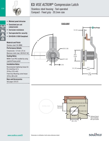 111AACTUAL SIZEwww.southco.com/E320.1 (.79) Ø 22.5 (.89)Optional: Roundhole installation with spur washerFixed grip36 (1.42)DoorFrame13 (.51)3.5 (.14) 27.7 (1.09)Ø 26 (1.03)34.9 (1.38)Ø 32 (1.26)90ºØ 17 (.67)8 (.31)E3 VISE ACTION ® Compression LatchStainless steel housing · Tool operated Compact · Fixed grip · 20.1mm size• Minimal panel intrusion• Consistent pre-set compression• Corrosion resistance• Tool operated for security• EN 45545-3 E60 CompliantMaterial and FinishStainless steel 316 (MIM)Performance DetailsCompression: 6.4 mm (.25 in) Maximum static load: 300 N (67 lbf)Sealing NotesNEMA 4 and IP65 enabled by using supplied flange gasketInstallation NotesRecommended tightening torque for the mounting nut is20 N·m (176 in·lbf)Fixed Grip: Mounting screw torque 10 N·m (88 in·lbf)Keys and AccessoriesSee pages 118-121FIXED GRIPG Grip RangeDimensions in millimeters (inch) unless otherwise stated