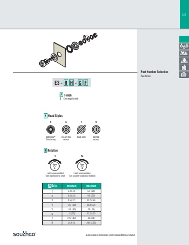 117Dimensions in millimeters (inch) unless otherwise statedG Grip Minimum Maximum1 3.2 (.13) 6.4 (.25)2 6.4 (.25) 9.5 (.37)3 9.5 (.37) 12.7 (.50)4 12.7 (.50) 15.9 (.63)5 15.9 (.63) 19 (.75)6 19 (.75) 22.2 (.87)7 22.2 (.87) 25.4 (1)8 25.4 (1) 28.6 (1.13)E3 - R H - G FF Finish2 ElectropolishedH Head StylesSOUTHCO Knob style ®Tubular key5Slotted recess98 (.32) Hexrecess6 7Type“A”Type“B”Turn clockwiseto latchTurn counter-clockwiseto latchR Rotation5 24Latch unassembledTurn counter-clockwise to latchLatch unassembledTurn clockwise to latchType“A”Type“B”Turn clockwiseto latchTurn counter-clockwiseto latchPart Number SelectionSee table