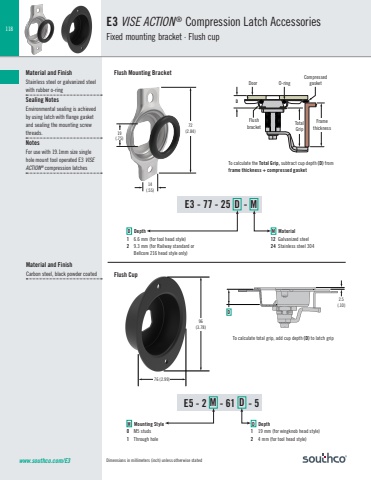 118www.southco.com/E372(2.84)D14(.55)19(.75)2.5(.10)76 (2.99)96(3.78)DDimensions in millimeters (inch) unless otherwise statedE3 VISE ACTION ® Compression Latch Accessories Fixed mounting bracket · Flush cupMaterial and FinishStainless steel or galvanized steel with rubber o-ringSealing NotesEnvironmental sealing is achieved by using latch with flange gasket and sealing the mounting screw threads.NotesFor use with 19.1mm size single hole mount tool operated E3 VISE ACTION® compression latchesMaterial and FinishCarbon steel, black powder coatedFlush Mounting BracketFlush CupCompressedgasketTotalGripO-ringFlushbracketDoorFramethicknessTo calculate the Total Grip, subtract cup depth (D) from frame thickness + compressed gasketTo calculate total grip, add cup depth (D) to latch gripE3 - 77 - 25 D - MD Depth1 6.6 mm (for tool head style)2 9.3 mm (for Railway standard or Bellcore 216 head style only)M Material12 Galvanized steel24 Stainless steel 304E5 - 2 M - 61 D - 5M Mounting Style0 M5 studs1 Through holeD Depth1 19 mm (for wingknob head style)2 4 mm (for tool head style)