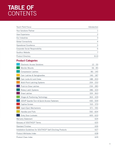Touch Point Focus IntroductionYour Solutions Partner 1User Experience 2Our Industries 3Global Connectivity 4Operational Excellence 5Corporate Social Responsibility 6Southco Website 7Product Directory 8-10Product CategoriesElectronic Access Solutions 12 - 55Monitor Mounts 56 - 85Compression Latches 86 - 145 Cam Latches & Swinghandles 146 - 187Cam Locks & Lock Cores 188 - 203Multi-Point Latching Systems 204 - 233Push-to-Close Latches 234 - 285Rotary Latch Systems 286 - 323Draw Latches 324 - 363Hinges & Positioning Technology 364 - 429DZUS® Quarter-Turn & Quick Access Fasteners 430 - 509Captive Screws 510 - 570Inject-Eject Mechanisms 571 - 591Handles and Pulls 592 - 604Entry Door Locksets 605 - 623Warranty Statement 624Glossary of SOUTHCO® Terms 625Standard Finishes 626Installation Guidelines for SOUTHCO® Self-Clinching Products 627Product Attributes Index 628Product Class Index 629TABLE OF CONTENTS11