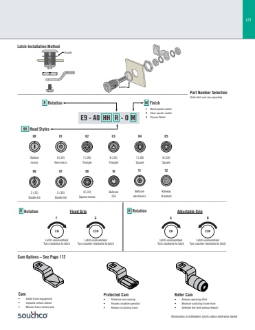 123Dimensions in millimeters (inch) unless otherwise statedFixed GripCam Options – See Page 112Cam• Stable frame engagement• Improved surface contact• Minimal frame surface prepProtected Cam• Protective cam covering• Provides smoother operation• Reduces scratching frameRoller Cam• Reduces operating effort• Minimize scratching frame finish• Detented feel (with optional keeper)Adjustable GripLatch Installation MethodHH Head StylesR Rotation M Finish8 (.32)Square recess08Order latch and cam separately1 Black powder coated2 Silver powder coated3 Chrome PlatedGasketE9 - A0 HH R - O M___________________________________________________________________________ Part Number Selection________________________________________________________________________________________________________________________________________________________________________________________R Rotation R RotationCWF G A BLatch unassembledTurn counter-clockwise to latchLatch unassembledTurn clockwise to latchLatch unassembledTurn counter-clockwise to latchLatch unassembledTurn clockwise to latchCCW CW CCW7 (.28)Triangle028 (.32)Hex recess00 01Slottedrecess8 (.32)Triangle037 (.28)Square04Railwaystandard12Bellcore216103 (.11)Double bit068 (.32)Square05Bellcoreelectronics115 (.19)Double bit07Gasket