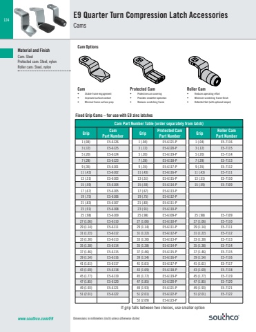 124Dimensions in millimeters (inch) unless otherwise statedGrip CamPart Number1 (.04) E5-61263 (.12) E5-61255 (.20) E5-61247 (.28) E5-61239 (.35) E5-610111 (.43) E5-610213 (.51) E5-610315 (.59) E5-610417 (.67) E5-610519 (.75) E5-610621 (.83) E5-610723 (.91) E5-610825 (.98) E5-610927 (1.06) E5-611029 (1.14) E5-611131 (1.22) E5-611233 (1.30) E5-611335 (1.38) E5-611437 (1.46) E5-611539 (1.54) E5-611641 (1.61) E5-611743 (1.69) E5-611845 (1.77) E5-611947 (1.85) E5-612049 (1.93) E5-612151 (2.01) E5-6122Grip Protected CamPart Number1 (.04) E5-6121-P3 (.12) E5-6120-P5 (.20) E5-6119-P7 (.28) E5-6118-P9 (.35) E5-6117-P11 (.43) E5-6116-P13 (.51) E5-6115-P15 (.59) E5-6114-P17 (.67) E5-6113-P19 (.75) E5-6112-P21 (.83) E5-6111-P23 (.91) E5-6110-P25 (.98) E5-6109-P27 (1.06) E5-6110-P29 (1.14) E5-6111-P31 (1.22) E5-6112-P33 (1.30) E5-6113-P35 (1.38) E5-6114-P37 (1.46) E5-6115-P39 (1.54) E5-6116-P41 (1.61) E5-6117-P43 (1.69) E5-6118-P45 (1.77) E5-6119-P47 (1.85) E5-6120-P49 (1.93) E5-6121-P51 (2.01) E5-6122-P53 (2.09) E5-6123-PGrip Roller CamPart Number1 (.04) E5-71163 (.12) E5-71155 (.20) E5-71147 (.28) E5-71139 (.35) E5-711211 (.43) E5-711113 (.51) E5-711015 (.59) E5-710925 (.98) E5-710927 (1.06) E5-711029 (1.14) E5-711131 (1.22) E5-711233 (1.30) E5-711335 (1.38) E5-711437 (1.46) E5-711539 (1.54) E5-711641 (1.61) E5-711743 (1.69) E5-711845 (1.77) E5-711947 (1.85) E5-712049 (1.93) E5-712151 (2.01) E5-7122Material and FinishCam: Steel Protected cam: Steel, nylon Roller cam: Steel, nylonE9 Quarter Turn Compression Latch AccessoriesCamsCam• Stable frame engagement• Improved surface contact• Minimal frame surface prepProtected Cam• Protective cam covering• Provides smoother operation• Reduces scratching frameRoller Cam• Reduces operating effort• Minimize scratching frame finish• Detented feel (with optional keeper)Cam OptionsFixed Grip Cams – for use with E9 zinc latchesIf grip falls between two choices, use smaller optionwww.southco.com/E9Cam Part Number Table (order separately from latch)