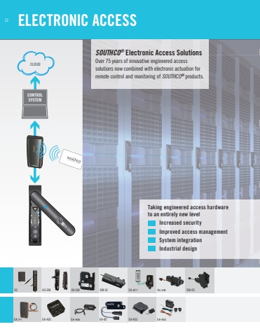 12 ELECTRONIC ACCESSCONTROLSYSTEMCLOUDEA-P3SCEA-A01H3-EMEA-A06R4-EM EM-10EA-R01EA-KC2EA-R02AC-EM EM-05EA-P3SOUTHCO® Electronic Access SolutionsOver 75 years of innovative engineered access solutions now combined with electronic actuation for remote control and monitoring of SOUTHCO® products.Taking engineered access hardware to an entirely new level Increased security Improved access management System integration Industrial designEA-BT