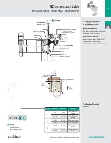 131ACTUALSIZE___________________________________________________________________________ Part Number SelectionSee table21 (.81)3 (.11) Compression17 (.66) 27 (1.06)13 (.50)11 (.44)9(.34)32 (1.25) 34 (1.34)LockwasherJam nutCam retaining clipMounting lockwasherMounting nutHandleLong pinSleeve 3/8-24 threadLIFTANDTURNShaftM5 thread Deep offset cam, reversedShallow offset cam, reversedOffset cam, reversedDoor thicknessMaximum 5 (.187)Gasket Frame for side latchingØ 9.5 (.37 ) Frame fortop latching16 (.63 )Door+2-1+2-1+.08-.04+.08-.0416 (.63 )8.1 (.32 )+0.1-0.0+.04-.0+0.1-0.0+.04-0Dimensions in millimeters (inch) unless otherwise statedG Grip Minimum Maximum Cam Type10 (0) 4 (.16) Deep offset cam, forward 28 (1.10) 34 (1.34) Deep offset cam, reversed 2 4 (.16) 10 (.39) Offset cam, forward 22 (.87) 28 (1.10) Offset cam, reverse 310 (.39) 16 (.63) Shallow offset cam, forward 16 (.63) 22 (.87) Shallow offset cam, reversed • Easy grip adjustment • Intuitive operationMaterial and FinishZinc alloy, powder coated or chrome plated and steel, zinc platedPerformance DetailsMaximum static load: 220 N (50 lbf) Compression: 3 mm (.11 in)62 Compression LatchLift & turn series · Handle style · Adjustable gripwww.southco.com/6262 - 20 - G FF Finish1 Polished chrome5 Black powder coated