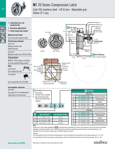134ACTUAL SIZEPart Number Selection _______________________________________________________________________________See tableSee page 257 for complimentary styled push to close versionwww.southco.com/M1AFrameDoorMaximum R 3.2 (.13)Optional panel prepShort cam 48±1.5 (1.88±0.06)Long cam 60±1.5 (2.38±0.06)Optional cut out27±0.5 (1.06±0.02)14.5± 0.5 (.57±0.02)Ø 50.8 ±0.5 (2.00±0.02) Door thickness61.5 (see part number selection)(2.42)Handle upStraight cam56.6 (2.23)4 (.16)CompressionM5 Screws(2) 30(1.18)3.5 (.14)Mounting bracket Non-lockingLong camOffset camreversed Deep offset cam reversed 70 (2.72) 61.3 (2.41) GasketLockingJam nuts(see table)NoteAll grips of 35 (1.38) or below, highlighted in , in the table above, are potentially a function of door thickness and may not always be achievable, depending on actual door thickness used. In this range of grips, the minimum achievable grip will be limited to actual door thickness + grip adjustment value, or the minimum values shown in the table, whichever is greater. Examples: For a door thickness of 4mm, the minimum achievable grip is 23 and is achieved with a deep offset cam in the forward position. (4 + 19 = 23)For a door thickness of 20mm, the minimum achievable grip is 29 and is achieved with an offset cam in the forward position. (20 + 9 = 29)Dimensions in millimeters (inch) unless otherwise statedL Lock style3 Non-locking8 Locking (2 keys supplied)9 Key-locking keyed alike S008 (2 overmolded keys supplied)• Consistent pre-set compression• Easy grip adjustment• Flush round hole installMaterial and FinishCast 316 grade stainless steelPerformance DetailsShort camMaximum static load:460 N (103 lbf)Long camMaximum static load: 350 N (78 lbf)Sealing NotesNEMA 4 / IP66 sealing is achieved by using supplied flange gasketKeysLock style 8 Part number: M1-546Lock style 9 Part number: M1-525-39-S008M1 20 Series Compression LatchCast 316 stainless steel · Lift & turn · Adjustable grip50mm (2”) sizeM1 - 20 - L D - G 8G Grip RangeShort cam5 21 - 28 (.83 - 1.10) Deep offset forward4 27 - 40 (1.06 - 1.57) Offset forward3 39 - 52 (1.54 - 2.05) Straight4 51 - 64 (2.01 - 2.52) Offset reversed5 63 - 76 (2.48 - 3.00) Deep offset reversedLong cam8 21 - 28 (.83 - 1.10) Deep offset forward7 27 - 40 (1.06 - 1.57) Offset forward6 39 - 52 (1.54 - 2.05) Straight7 51 - 64 (2.01 - 2.52) Offset reversed8 63 - 76 (2.48 - 3.00) Deep offset reversedD Door Thickness Grip Adjustment Value1 2 - 12 (.075 - .475) 19 (.75)2 12 - 22.5 (.475 - .885) 9 (.35)3 18.5 - 29 (.73 - 1.14) 2.5 (.10)