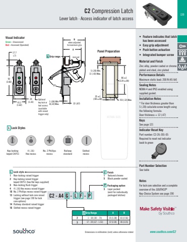 139___________________________________________________________________________ Part Number SelectionSee table• Feature indicates that latch has been accessed• Easy grip adjustment• Push button actuation• Integrated bumper screwMaterial and FinishZinc alloy, powder coated or chrome plated and steel, zinc platedPerformance DetailsMaximum static load: 200 N (45 lbf)Sealing NotesNEMA 4 and IP65 enabled using supplied gasket.Installation Notes* For door thickness greater than 5 (.20) calculate screw length using the following formula:Door thickness + 12 (.47)KeysSee page 121Indicator Reset KeyPart number: C2-26-301-05Required to reset red indicatorback to greenC2 Compression LatchLever latch · Access indicator of latch accessACTUAL SIZEDimensions in millimeters (inch) unless otherwise stated41.1(1.62)34(1.33)93(3.66)17.7(.7)22 (.87)1 (.04) Min.8(.32) Max.55ºJam nutwww.southco.com/C2NotesFor lock core selection and a complete overview of the SOUTHCO®Key-Choice System see page 190L Lock style1 Non-locking raised trigger2 Key-locking raised trigger keyed CH751 (two flat keys supplied)3 Non-locking flush trigger4 4 (.16) Hex recess raised trigger10 No. 2 Phillips recess raised trigger13 Locking without lock core raisedtrigger (see page 190 for lockcore options)14 Railway standard raised trigger16 Slotted recess raised triggerF Finish1 Textured chrome5 Black powder coatedP Packaging option3 Layer packed(omit for individually C2 - A4 G packaged latches) - L F - PG Grip Range A B2 1 - 18 (.04 - .71) 35 (1.38) 65 (2.56)3 17 - 39 (.67 - 1.53) 57 (2.24) 85 (3.35)5 (.20) Min.11 (.43) Max.25 ±1(.98 ±.04) R3 (.12) Max.86 ±1(3.39 ±.04)41.1(1.62)34(1.33)93(3.66)17.7(.7)22 (.87)1 (.04) Min.8(.32) Max.55ºJam nutBwhen adjustedto maximum gripAL Lock StylesKey-lockingkeyed CH7514 (.16)Hex recessNo. 2 Phillips recessRailwaystandardSlottedrecessVisual IndicatorGreen – UnaccessedRed – Accessed (Operated) Panel PreparationG Grip rangeOptional key lock or tool access (available with raised trigger only)