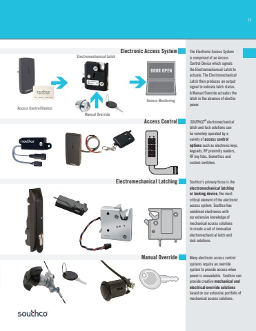 13The Electronic Access System is comprised of an Access Control Device which signals the Electromechanical Latch to actuate. The Electromechanical Latch then produces an output signal to indicate latch status. A Manual Override actuates the latch in the absence of electric power.SOUTHCO® electromechanical latch and lock solutions can be remotely operated by a variety of access control options such as electronic keys, keypads, RF proximity readers, RF key fobs, biometrics and custom switches.Southco's primary focus is the electromechanical latching or locking device, the most critical element of the electronic access system. Southco has combined electronics with our extensive knowledge of mechanical access solutions to create a set of innovative electromechanical latch and lock solutions.Many electronic access control systems require an override system to provide access when power is unavailable. Southco can provide creative mechanical and electrical override solutionsbased on our extensive portfolio of mechanical access solutions.Electronic Access SystemAccess Control DeviceAccess MonitoringManual OverrideElectromechanical LatchAccess ControlElectromechanical LatchingManual OverrideDOOR OPEN