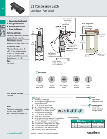 14034(1.34)17.5(.69)96(3.78)38(1.5)41(1.62)3.8(.15)25.8(1.02)Dimensions in millimeters (inch) unless otherwise statedC2 Compression LatchLever latch · Push to lockwww.southco.com/C2L Lock style1 Non-locking raised trigger2 Key-locking raised trigger keyed CH751(two flat keys supplied)4 4 (.16) Hex recess raised trigger10 No. 2 Phillips recess raised trigger13 Locking without lock core raised trigger(see page 190 for lock core options) 14 Railway standard raised trigger15 8 (.32) Hex recess raised trigger16 Slotted recess raised trigger22 Key-locking raised trigger keyed CH751 (two flat keys supplied); (key retained in unlocked position)34 Auto relock: 4 (.16) Hex recess flush trigger310 Auto relock: No. 2 Phillips recess flush trigger314 Auto relock: Railway standard flush trigger315 Auto relock: 8 (.32) Hex recess flush trigger316 Auto relock: Slotted recess flush triggerF Finish1 Bright chrome5 Black powder coatedP Packaging option3 Layer packed(omit for individually packaged latches) C2 - 5 G - L F - PG Grip Range A B2 1-18 (.04-.71) 35 (1.38) 63 (2.48)3 18-40 (.71-1.57) 57 (2.24) 84 (3.31)L Lock StylesKey-lockingkeyed CH7514 (.16)Hex recessNo. 2 Phillips recessRailwaystandardSlottedrecessB when adjusted to maximum gripGriprangeDoor Thickness1 (.04) Minimum5 (.20) Maximum5.9 (.23) - Non-lock6.7 (.26) - Key-lock, tool-lock3.8 (.15) - Auto-relock*Serrated Mounting Screw M5 x 16Mounting bracketHousingA atmaximum grip11 (.43) Maximum5 (.20) Minimum86±1(3.38±.04)25 ± 1(.98±. 04)2x R 10.5 ± 0.5(.41 ± .02)2x R 3 (.12)MaximumFrameDoorPanel PreparationPart Number Selection _______________________________________________________________________________See table• Low profile when latched• Easy grip adjustment• Push button actuation• Integrated bumperMaterial and FinishZinc alloy, powder coated or chrome plated and steel, zinc platedPerformance DetailsMaximum static load: 200 N (45 lbf)Installation Notes* Serrated Mounting Screw M5 x 16. For door thickness greater than 5 (.20) calculate screw length using the following formula: Door thickness + 12 (.47)KeysSee page 121NotesFor lock core selection and a complete overview of the SOUTHCO®Key-Choice System see page 190