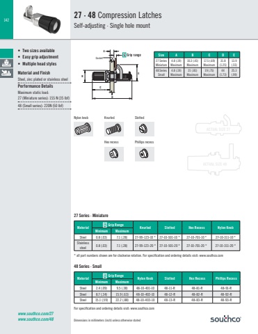 142BACDEGasket ACTUAL SIZE 27ACTUAL SIZE 48Dimensions in millimeters (inch) unless otherwise stated27 · 48 Compression LatchesSelf-adjusting · Single hole mount Nylon knob Knurled SlottedHex recess Phillips recess• Two sizes available• Easy grip adjustment• Multiple head stylesMaterial and FinishSteel, zinc plated or stainless steelPerformance Details Maximum static load: 27 (Miniature series): 155 N (35 lbf)48 (Small series): 220N (50 lbf)www.southco.com/27www.southco.com/48Material G Grip Range Nylon Knob Slotted Hex Recess Phillips RecessMinimum MaximumSteel 2.4 (.09) 9.5 (.38) 48-10-401-10 48-11-R 48-81-R 48-91-R Steel 8.7 (.34) 15.9 (.63) 48-10-402-10 48-12-R 48-82-R 48-92-R Steel 15.1 (.59) 22.2 (.88) 48-10-403-10 48-13-R 48-83-R 48-93-R Material G Grip Range Knurled Slotted Hex Recess Nylon KnobMinimum MaximumSteel 0.8 (.03) 7.1 (.28) 27-99-123-10 * 27-10-501-10 * 27-10-701-10 * 27-10-311-10 *Stainless steel 0.8 (.03) 7.1 (.28) 27-99-123-20 * 27-10-501-20 * 27-10-701-20 * 27-10-311-20 ** all part numbers shown are for clockwise rotation. For specification and ordering details visit: www.southco.comFor specification and ordering details visit: www.southco.comSize A B C D E27 Series Miniature4.8 (.19) Maximum10.3 (.41) Maximum17.5 (.69) Maximum31.8 (1.25)13.9 (.55)48 Series Small4.8 (.19) Maximum21 (.81) Maximum19 (.75) Maximum44 (1.73)25.3 (.99)48 Series · Small27 Series · Miniature