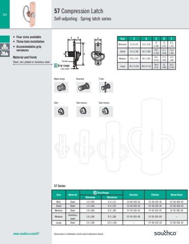 144ACTUAL SIZE LARGEACTUAL SIZE MINIACTUAL SIZE SMALLACTUAL SIZE MEDIUMA DB CE(see table)Gasket Dimensions in millimeters (inch) unless otherwise statedSize A B C D EMiniature 11.9 (.47) 13.5 (.53) 27 (1.06)7.5 (.03)8.5 (.33)Small 15.1 (.59) 14.7 (.58) 39.7 (1.56)11.1 (.44)11.6 (.46)Medium 19.1 (.75) 24.1 (.95) 58.7 (2.31)17.5 (.69)17.5 (.69)Large 26.2 (1.03) 28.2 (1.11) 88.9 (3.5)25 (.98)26.2 (1.03)Nylon knob Knurled T-barSlot Hex recess Tool recess57 Compression LatchSelf-adjusting · Spring latch serieswww.southco.com/57• Four sizes available• Three hole installation• Accommodates grip variancesMaterial and FinishSteel, zinc plated or stainless steelSize Material G Grip Range Knurled Slotted Nylon KnobMinimum MaximumMini Steel 1.2 (.05) 4.3 (.17) 57-20-201-10 57-20-101-10 57-20-401-10Small Steel 1.2 (.05) 6.4 (.25) 57-30-201-10 57-30-101-10 57-30-401-10Medium Steel 1.6 (.06) 9.5 (.38) 57-10-201-10 57-10-101-10 57-10-401-10Medium Stainless steel 1.6 (.06) 9.5 (.38) 57-10-201-40 57-10-101-40 ~Large Steel 2.4 (.09) 14.3 (.56) ~ 57-40-101-10 57-40-401-1057 Series