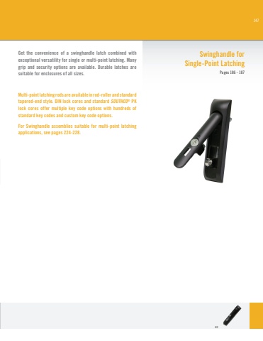 147Get the convenience of a swinghandle latch combined with exceptional versatility for single or multi-point latching. Many grip and security options are available. Durable latches are suitable for enclosures of all sizes. Multi-point latching rods are available in rod-roller and standard tapered-end style. DIN lock cores and standard SOUTHCO® PK lock cores offer multiple key code options with hundreds of standard key codes and custom key code options. For Swinghandle assemblies suitable for multi-point latching applications, see pages 224-228.Swinghandle for Single-Point LatchingPages 186 - 187H3