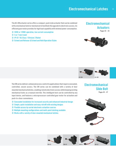 15The EM series delivers enhanced access control to applications that require concealed, controlled, secure access. The EM series can be combined with a variety of door mounted mechanical latches, enabling remote electronic access while keeping existing mechanical locks as a manual override. This intelligent lock can be controlled by any input device, and features a microprocessor-controlled gear motor for actuation and push-to-close convenience. Concealed installation for increased security and enhanced industrial design Simple, quick installation and easy retrofi t with existing designs Flexible access by varied electronic actuation sources Multiple mounting confi gurations and multi-point latching available Works with a variety of door-mounted mechanical latchesThe AC-EM actuator series offers a compact, push style actuator that can be combined with a mechanical latch or mechanism to facilitate the upgrade to electronic access. An effi cient gear motor provides for high load capability with minimal power consumption. 5VDC or 12VDC operation, low current consumption 5 or 7 mm travel IP-67 / UL Class 1 Division 2 Rated Extend and Release & Extend and Hold Operation StylesElectromechanical ActuatorsPages 42 - 43ElectromechanicalSlide BoltPages 44 - 47 EM-05 EM-10AC-EMElectromechanical LatchesEM-05AC-EMEM-05