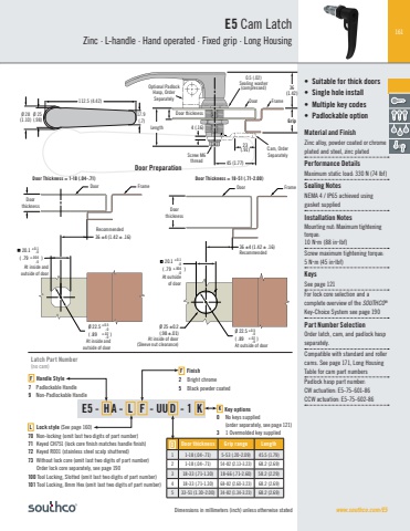 161Dimensions in millimeters (inch) unless otherwise statedACTUAL SIZE• Suitable for thick doors• Single hole install• Multiple key codes• Padlockable optionMaterial and FinishZinc alloy, powder coated or chrome plated and steel, zinc plated Performance DetailsMaximum static load: 330 N (74 lbf)Sealing NotesNEMA 4 / IP65 achieved using gasket supplied Installation NotesMounting nut: Maximum tightening torque: 10 Nm (88 inlbf) Screw maximum tightening torque: 5 Nm (45 inlbf)KeysSee page 121For lock core selection and a complete overview of the SOUTHCO®Key-Choice System see page 190Part Number SelectionOrder latch, cam, and padlock hasp separately.Compatible with standard and roller cams. See page 171, Long Housing Table for cam part numbersPadlock hasp part number:CW actuation: E5-75-601-86CCW actuation: E5-75-602-86D Door thickness Grip range Length1 1-18 (.04-.71) 5-53 (.20-2.09) 45.5 (1.79)2 1-18 (.04-.71) 54-82 (2.13-3.23) 68.2 (2.69)3 18-33 (.71-1.30) 18-66 (.71-2.60) 58.2 (2.29)4 18-33 (.71-1.30) 68-82 (2.60-3.23) 68.2 (2.69)5 33-51 (1.30-2.00) 34-82 (1.34-3.23) 68.2 (2.69)E5 - H A - L F - UU D - 1 KE5 Cam Latch Zinc · L-handle · Hand operated · Fixed grip ∙ Long HousingL Lock style (See page 160)70 Non-locking (omit last two digits of part number)71 Keyed CH751 (lock core finish matches handle finish)72 Keyed R001 (stainless steel scalp shuttered)73 Without lock core (omit last two digits of part number) Order lock core separately, see page 190100 Tool Locking, Slotted (omit last two digits of part number)101 Tool Locking, 8mm Hex (omit last two digits of part number) F Finish2 Bright chrome5 Black powder coatedF Handle Style7 Padlockable Handle9 Non-Padlockable HandleØ 25(.98)112.5 (4.42)Ø 28(1.10)17.9 (.7)www.southco.com/E5K Key options0 No keys supplied(order separately, see page 121)3 1 Overmolded key suppliedLatch Part Number(no cam)Door Preparation45 (1.77)19(.75)5 (.2)0.5 (.02)4 (.16)36 ±4 (1.42 ± .16) 20.1( .79 )+0.1-0+.004-0Ø 22.5( .89 )+0.5-0+.02-036 ±4 (1.42 ± .16) 20.1( .79 )+0.1-0+.004-0Ø 25 ±0.2(.98 ±.01) Ø 22.5( .89 )+0.5-0+.02-0LAt outside of doorAt outside of doorDoor thicknessDoor thicknessDoor Frame Door FrameDoor Thickness = 1-18 (.04-.71) Door Thickness = 18-51 (.71-2.00)At inside of door(Sleeve nut clearance) At inside and outside of doorAt inside and outside of doorRecommendedRecommended4 (.16)36(1.42)45 (1.77)23(.91)Door FrameGripCam, Order Screw M6 SeparatelythreadLengthDoor thicknessOptional Padlock Hasp, OrderSeparately0.5 (.02)Sealing washer(compressed)