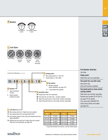 165Dimensions in millimeters (inch) unless otherwise stated www.southco.com/E5E5 - 9 R - L 5 - A S - 1 KR Rotation1 Type A clockwise to latch2 Type B counterclockwise to latchL Lock Style30 Non-locking (omit last 2 digits from part number)31 Key-locking black lock core keyed alike CH751 32 Key-locking stainless steel scalp and shuttered lock core keyed alike R00133 Without lock core (omit last 2 digits from part number) Order lock core separately, see page 190A Assembly statusUU Single point order cam separatelyRR Two point (for use with rods) - actuator suppliedTR Type A two point push-to-close (order actuator separately)TL Type B two point push-to-close (order actuator separately)Single pointOrder latch and cam separately Two point (for use with rods)Order latch only (two point actuator supplied)Two point push-to-close action (spring loaded)Order latch and actuator separately. Actuator part number A5-91-201-11,see page 172 for details.To be used with SOUTHCO® R4 rotary series latches and cables see page 322.Cam Part Number Table (order separately from latch)Grip Part Number Grip Part Number22.7 (.89) E5-6603 30.7 (1.21) E5-660724.7 (.97) E5-6604 32.7 (1.29) E5-660826.7 (1.05) E5-6605 34.7 (1.37) E5-660928.7 (1.13) E5-6606 36.7 (1.44) E5-6610Type“A”Type“B”Turn clockwiseto latchTurn counter-clockwiseto latchK Key options0 No keys supplied(order separately, see page 121)3 1 Overmolded key suppliedS Sealing option0 Non-sealing (when A = TR or TL)1 Sealed (when A = UU or RR)Non-locking Key-lockingkey code R001Key-locking (order lock core separately)Key-lockingkey code CH751L Lock StylesR RotationIf grip falls between two choices, use the smaller optionLatch Part Number (no cam)___________________________________________________________________________ Part Number SelectionSee table