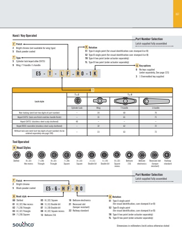 167Dimensions in millimeters (inch) unless otherwise statedH Head style00 Slotted01 8 (.32) Hex recess02 7 (.28) Triangle03 8 (.32) Triangle04 7 (.28) Square05 8 (.32) Square06 3 (.11) Double bit07 5 (.19) Double bit08 8 (.32) Square recess13 Bellcore 21619 Bellcore electronics 21 Recessed slot (tamper resistant) 22 Railway standardSlotted 8 (.32)Hex recess7 (.28)Triangle8 (.32)Triangle7 (.28)Square8 (.32) Square3 (.11)Double bit5 (.19)Double bit8 (.32) Square recessBellcore 216Bellcore electronicsRecessed slot (tamper resistant)Railway standardE5 - 6 - H F - R 0F Finish2 Bright chrome5 Black powder coatedR Rotation51 Type A single point (for visual identification, cam stamped A or B)52 Type B single point(for visual identification, cam stamped A or B) TR Type A two point (order actuator separately)TL Type B two point (order actuator separately)E5 - T - L F - R 0 - 1 KF Finish2 Bright chrome (not available for wing type)5 Black powder coatedR Rotation51 Type A single point (for visual identification cam stamped A or B) 52 Type B single point (for visual identification cam stamped A or B)TR Type A two point (order actuator separately)TL Type B two point (order actuator separately)Part Number SelectionLatch supplied fully assembledHand / Key OperatedTool OperatedPart Number SelectionLatch supplied fully assembledH Head StylesK Key options0 No keys supplied(order separately, See page 121) 3 1 Overmolded key suppliedLLock styleT = 5 T = 9Cylinder Lock Wing T-handle L-handleNon-locking (omit last two digits of part number) ~ 30 60 70Keyed CH751 (lock core finish matches handle finish) ~ 31 61 71Keyed CH751 (stainless steel scalp shuttered) 40 ~ ~ ~Keyed R001 reversible (stainless steel scalp shuttered) ~ 32 62 72Without lock core (omit last two digits of part number) (to be ordered separately see page 190) ~ 33 63 73T Type5 Cylinder lock keyed alike CH7519 Wing / T-handle / L-handle