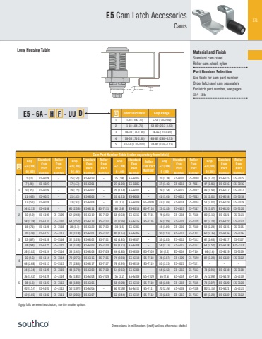 171Dimensions in millimeters (inch) unless otherwise statedCam Part Number Table (order separately from latch)DGrip+2 (.08)-0 (.00)Standard Cam PartNumberRoller Cam PartNumberGrip+2 (.08)-0 (.00)Standard Cam PartNumberRoller Cam PartNumberGrip+2 (.08)-0 (.00)Standard Cam PartNumberRoller Cam PartNumberGrip+2 (.08)-0 (.00)Standard Cam PartNumberRoller Cam PartNumberGrip+2 (.08)-0 (.00)Standard Cam PartNumberRoller Cam PartNumber15 (.2) E5-6028 - 15 (.59) E5-6023 - 25 (.98) E5-6005 - 35 (1.38) E5-6010 E5-7010 45 (1.77) E5-6015 E5-70157 (.28) E5-6027 - 17 (.67) E5-6001 - 27 (1.06) E5-6006 - 37 (1.46) E5-6011 E5-7011 47 (1.85) E5-6016 E5-70169 (.35) E5-6026 - 19 (.75) E5-6002 - 29 (1.14) E5-6007 - 39 (1.54) E5-6012 E5-7012 49 (1.93) E5-6017 E5-701711 (.43) E5-6025 - 21 (.83) E5-6003 - 31 (1.22) E5-6008 - 41 (1.61) E5-6013 E5-7013 51 (2.01) E5-6018 E5-701813 (.51) E5-6024 - 23 (.91) E5-6004 - 33 (1.3) E5-6009 E5-7009 43 (1.69) E5-6014 E5-7014 53 (3.07) E5-6019 E5-7019254 (2.13) E5-6108 - 60 (2.36) E5-6111 E5-7111 66 (2.6) E5-6114 E5-7114 72 (2.83) E5-6117 E5-7117 78 (3.07) E5-6120 E5-712056 (2.2) E5-6109 E5-7109 62 (2.44) E5-6112 E5-7112 68 (2.68) E5-6115 E5-7115 74 (2.91) E5-6118 E5-7118 80 (3.15) E5-6121 E5-712158 (2.28) E5-6110 E5-7110 64 (2.52) E5-6113 E5-7113 70 (2.76) E5-6116 E5-7116 76 (2.99) E5-6119 E5-7119 82 (3.23) E5-6122 E5-7122318 (.71) E5-6128 E5-7118 28 (1.1) E5-6123 E5-7113 38 (1.5) E5-6105 - 48 (1.89) E5-6110 E5-7110 58 (2.28) E5-6115 E5-711520 (.79) E5-6127 E5-7117 30 (1.18) E5-6101 E5-7112 40 (1.57) E5-6106 - 50 (1.97) E5-6111 E5-7111 60 (2.36) E5-6116 E5-711622 (.87) E5-6126 E5-7116 32 (1.26) E5-6102 E5-7111 42 (1.65) E5-6107 - 52 (2.05) E5-6112 E5-7112 62 (2.44) E5-6117 E5-711724 (.94) E5-6125 E5-7115 34 (1.34) E5-6103 E5-7110 44 (1.73) E5-6108 - 54 (2.13) E5-6113 E5-7113 64 (2.52) E5-6118 E75-711826 (1.02) E5-6124 E5-7114 36 (1.42) E5-6104 E5-7109 46 (1.81) E5-6109 E5-7109 56 (2.2) E5-6114 E5-7114 66 (2.6) E5-6119 E5-7119466 (2.6) E5-6114 E5-7114 70 (2.76) E5-6116 E5-7116 74 (2.91) E5-6118 E5-7118 78 (3.07) E5-6120 E5-7120 82 (3.23) E5-6122 E5-712268 (2.68) E5-6115 E5-7115 72 (2.83) E5-6117 E5-7117 76 (2.99) E5-6119 E5-7119 80 (3.15) E5-6121 E5-7121 - - -534 (1.34) E5-6125 E5-7115 44 (1.73) E5-6103 E5-7110 54 (2.13) E5-6108 - 64 (2.52) E5-6113 E5-7113 74 (2.91) E5-6118 E5-711836 (1.42) E5-6124 E5-7114 46 (1.81) E5-6104 E5-7109 56 (2.2) E5-6109 E5-7109 66 (2.6) E5-6114 E5-7114 76 (2.99) E5-6119 E5-711938 (1.5) E5-6123 E5-7113 48 (1.89) E5-6105 - 58 (2.28) E5-6110 E5-7110 68 (2.68) E5-6115 E5-7115 78 (3.07) E5-6120 E5-712040 (1.57) E5-6101 E5-7112 50 (1.97) E5-6106 - 60 (2.36) E5-6111 E5-7111 70 (2.76) E5-6116 E5-7116 80 (3.15) E5-6121 E5-712142 (1.65) E5-6102 E5-7111 52 (2.05) E5-6107 - 62 (2.44) E5-6112 E5-7112 72 (2.83) E5-6117 E5-7117 82 (3.23) E5-6122 E5-7122Long Housing TableE5 Cam Latch AccessoriesCamsD Door Thickness Grip Range1 1-18 (.04-.71) 5-53 (.20-2.09)2 1-18 (.04-.71) 54-82 (2.13-3.23)3 18-33 (.71-1.30) 18-66 (.71-2.60)4 18-33 (.71-1.30) 68-82 (2.60-3.23)5 33-51 (1.30-2.00) 34-82 (1.34-3.23)E5 - 6A - H F - UU D Material and FinishStandard cam: steelRoller cam: steel, nylonPart Number SelectionSee table for cam part numberOrder latch and cam separatelyFor latch part number, see pages 154-155 If grip falls between two choices, use the smaller options