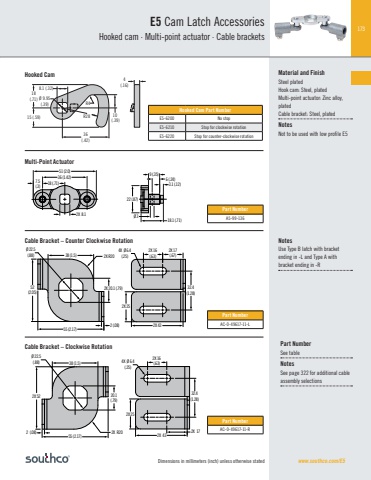 173Dimensions in millimeters (inch) unless otherwise stated www.southco.com/E5E5 Cam Latch AccessoriesHooked cam · Multi-point actuator · Cable brackets51 (2.0)36 (1.42)18 (.71) 7.5(.3)2X 8.122 (.87)18.1 (.71)9 (.35)Ø 33.1 (.12)6 (.24)Multi-Point ActuatorCable Bracket – Counter Clockwise RotationCable Bracket – Clockwise RotationPart NumberA5-99-136Part NumberAC-0-49617-11-LPart NumberAC-0-49617-11-R52(2.05)38 (1.5)Ø 22.5(.88)55 (2.17) 2 (.08)2X R202X 20.1 (.79)2X 16(.63)32.4(1.28)2X 252X 434X Ø 6.4(.25)2X 17(.67)38 (1.5)2X 5255 (2.17)2 (.08) 2X R2020.1(.79)2X 252X 432X 1732.4(1.28)2X 16(.63)Ø 22.5(.88) 4X Ø 6.4(.25)Hooked Cam Part NumberE5-6200 No stopE5-6210 Stop for clockwise rotationE5-6220 Stop for counter-clockwise rotation10 (.39)4(.16)36(.42)R48.1 (.32)Ø 9.95(.39)R2818(.71)15 (.59)Hooked Cam Material and FinishSteel platedHook cam: Steel, platedMulti-point actuator: Zinc alloy, platedCable bracket: Steel, platedNotesNot to be used with low profile E5Part NumberSee tableNotesSee page 322 for additional cable assembly selectionsNotesUse Type B latch with bracket ending in -L and Type A with bracket ending in -R