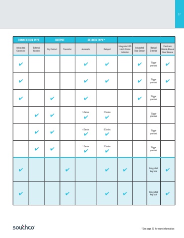 17CONNECTION TYPE OUTPUT RELOCK TYPE*Integrated ConnectorExternal Harness Dry Contact Transistor Automatic DelayedIntegrated LEDLatch StatusIndicatorIntegratedDoor SensorManual OverrideElectronic Unlock; ManualDoor Release Trigger provided Trigger provided Trigger provided 5 Series7 SeriesTrigger provided 4 Series6 SeriesTrigger provided 1 Series2 SeriesTrigger provided Integrated key lock Integrated key lock *See page 21 for more information