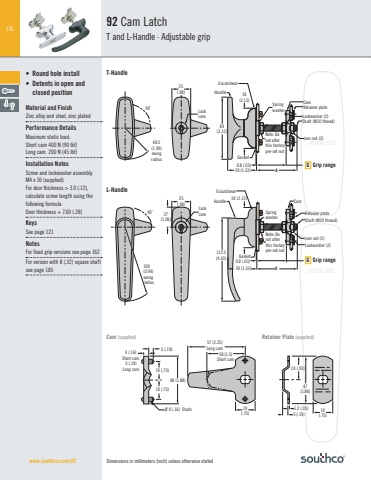 176Dimensions in millimeters (inch) unless otherwise statedACTUAL SIZEACTUAL SIZELockcoreLockcoreEscutcheonEscutcheon54(2.13)HandleHandle84(3.31)25(.98)25(.98)CamCamRetainer plateRetainer plateJam nut (2)Spring washerSpring washerShaft (M10 thread)Shaft (M10 thread)Note: Do not alter this factorypre-set nutNote: Do not alter this factorypre-set nutLockwasher (2)Lockwasher (2)Grip range0.8 (.03)39 (1.53) A AGasket Gasket 90˚ 48.5(1.90)swingradius100 (3.94)swing radius0.8 (.03)39 (1.53)112.5(4.43)27(1.06)54 (2.13)Jam nut (2)90˚ GG Grip range92 Cam LatchT and L-Handle · Adjustable grip• Round hole install• Detents in open and closed positionMaterial and FinishZinc alloy and steel, zinc plated Performance DetailsMaximum static load: Short cam 400 N (90 lbf)Long cam 200 N (45 lbf)Installation NotesScrew and lockwasher assembly M4 x 10 (supplied). For door thickness > 3.0 (.12), calculate screw length using the following formula: Door thickness + 7.00 (.28)KeysSee page 121NotesFor fixed grip versions see page 162For version with 8 (.32) square shaft see page 1854 (.16)Short cam24 (.93)47(1.86)1.2 (.05)5 (.19)19(.75)5 (.19) 19 (.75) 19 (.75)48 (1.88)Ø 4 (.16) Studs 19(.75)38 (1.5)Short cam57 (2.25)Long cam5 (.19)Long camwww.southco.com/92Cam (supplied) Retainer Plate (supplied)T-HandleL-Handle