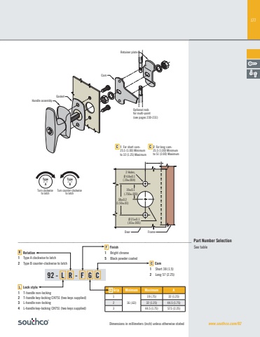 177Dimensions in millimeters (inch) unless otherwise statedHandle assemblyGasketCamRetainer plateOptional rodsfor multi-point(see pages 230-231)38±0.2(1.50±.01)Ø 21±0.1(.83±.005)Door Frame1 For short cam:25.5 (1.00) Minimumto 32 (1.25) Maximum2 Holes,Ø 4.8±0.1(.19±.004)19±0.1 (.750±.005)2 For long cam:25.5 (1.00) Minimumto 51 (2.00) MaximumC CType“A”Type“B”Turn clockwiseto latchTurn counter-clockwiseto latchL Lock style1 T-handle non-locking2 T-handle key-locking CH751 (two keys supplied)3 L-handle non-locking4 L-handle key-locking CH751 (two keys supplied)92 - L R - F G CR Rotation1 Type A clockwise to latch2 Type B counter-clockwise to latchF Finish1 Bright chrome5 Black powder coatedC Cam 1 Short 38 (1.5)2 Long 57 (2.25)___________________________________________________________________________ Part Number SelectionSee tablewww.southco.com/92G Grip Minimum Maximum A116 (.63)19 (.75) 32 (1.25)2 32 (1.25) 44.5 (1.75)3 44.5 (1.75) 57.5 (2.25)