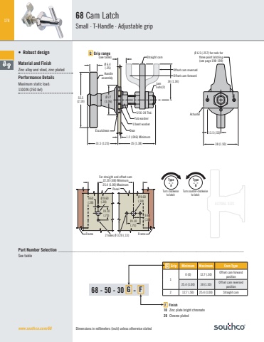 178Dimensions in millimeters (inch) unless otherwise statedACTUAL SIZE68 Cam Latch Small · T-Handle · Adjustable grip• Robust designMaterial and FinishZinc alloy and steel, zinc plated Performance DetailsMaximum static load:1100 N (250 lbf) 13.5 (.53)38 (1.50)34 (1.34)Ø 6.4 (.25)Ø 27(1.06)55.5(2.19)1.2 (.046) Minimum31.5 (1.23) 35 (1.38)HandleassemblyStraight camJam nuts(2)Tab washerU bent washerEscutcheon DoorActuatorGrip range(see table)5/16-24 Thd.Ø 6.5 (.257) for rods forthree point latching(see page 198-199)Offset cam forwardOffset cam reversedG19.10(.75)9.60(.38)Ø 9.60 (.38)PanelFrameFor straight and offset cam22.20 (.88) Minimum25.4 (1.00) MaximumFrame 2 holes Ø 3.20 (.13)Ø 9.60(.38)19.10(.75)9.60(.38)F Finish10 Zinc plate bright chromate20 Chrome plated68 - 50 - 30 G - FG Grip Minimum Maximum Cam Type10 (0) 12.7 (.50) Offset cam forward position25.4 (1.00) 38 (1.50) Offset cam reversed position2 12.7 (.50) 25.4 (1.00) Straight camPart Number Selection _______________________________________________________________________________See tablewww.southco.com/68Type“A”Type“B”Turn clockwiseto latchTurn counter-clockwiseto latch