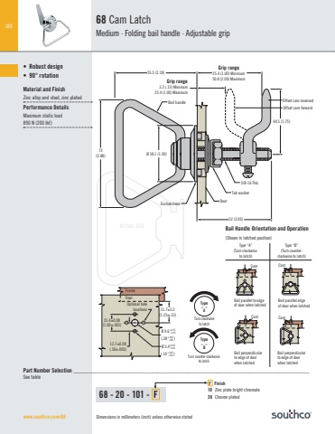 180Dimensions in millimeters (inch) unless otherwise statedACTUAL SIZE68 Cam Latch Medium · Folding bail handle · Adjustable grip• Robust design• 90° rotationMaterial and FinishZinc alloy and steel, zinc platedPerformance DetailsMaximum static load890 N (200 lbf) 44.5 (1.75) Ø 38.1 (1.50) 73(2.88)52 (2.05)Tab washerDoor EschutcheonBail handle3/8-16 Thd.55.5 (2.19)Grip range25.4 (1.00) Minimum50.8 (2.00) Maximum Grip range3.2 (.13) Minimum25.4 (1.00) MaximumOffset cam forwardOffset cam reversedFrameDoor25.4±0.08(1.00±.003)31.7±3.2(1.25±.13)Optional holelocations12.7±0.08(.50±.003)Ø 9.6 +0.05 -0.00+.002 -.000Ø 3.4+0.05 -0.00+.002 -.000(.38 )(.14 )Cam CamCam CamType “B”(Turn counterclockwise to latch)Type “A”(Turn clockwise to latch)Bail parallel edge of door when latchedBail parallel to edgeof door when latchedBail perpendicularto edge of doorwhen latchedBail perpendicularto edge of doorwhen latchedF Finish10 Zinc plate bright chromate 68 - 20 - 101 - F 20 Chrome platedPart Number Selection _______________________________________________________________________________See tablewww.southco.com/68Type“A”Type“B”Turn clockwiseto latchTurn counter-clockwiseto latchBail Handle Orientation and Operation (Shown in latched position)Cam CamCam CamType “B”(Turn counterclockwise to latch)Type “A”(Turn clockwise to latch)Bail parallel edge of door when latchedBail parallel to edgeof door when latchedBail perpendicularto edge of doorwhen latchedBail perpendicularto edge of doorwhen latched