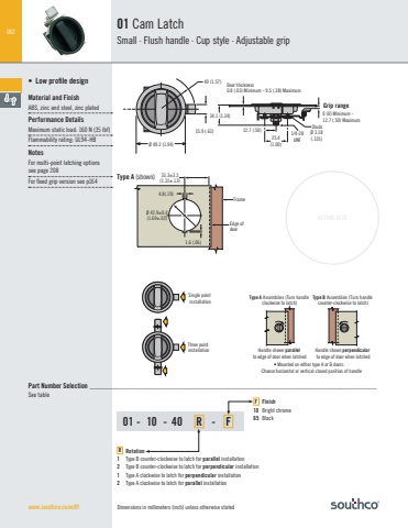 182Dimensions in millimeters (inch) unless otherwise statedACTUAL SIZE01 Cam LatchSmall · Flush handle · Cup style · Adjustable grip• Low profile designMaterial and FinishABS, zinc and steel, zinc plated Performance DetailsMaximum static load: 160 N (35 lbf)Flammability rating: UL94-HB NotesFor multi-point latching optionssee page 208For fixed grip version see p164Single point installationThree point installationType B Assemblies (Turn handle counter-clockwise to latch)Type A Assemblies (Turn handle clockwise to latch)Handle shown perpendicular to edge of door when latchedHandle shown parallelto edge of door when latched• Mounted on either type A or B doors. Choose horizontal or vertical closed position of handleFrameEdge of door33.3±3.2(1.31±.13)4.8(.19)Ø 42.9±0.4(1.69±.02)1.6 (.06)R Rotation1 Type B counter-clockwise to latch for parallel installation2 Type B counter-clockwise to latch for perpendicular installation1 Type A clockwise to latch for perpendicular installation2 Type A clockwise to latch for parallel installation01 - 10 - 40 R - FF Finish10 Bright chrome65 Black 15.9 (.63)40 (1.57)Ø 49.2 (1.94)34.1 (1.34)12.7 (.50) 1/4-28 UNFGrip range StudsØ 3.18 25.4 (.125) (1.00)Door thickness0.8 (.03) Minimum - 9.5 (.38) Maximum0 (0) Minimum -12.7 (.50) Maximumwww.southco.com/01Type A (shown)Part Number Selection _______________________________________________________________________________See table