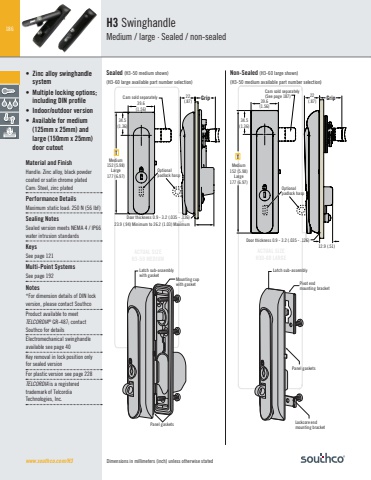 186Dimensions in millimeters (inch) unless otherwise statedACTUAL SIZEH3-50 MEDIUMACTUAL SIZEH30-60 LARGEwww.southco.com/H3H3 SwinghandleMedium / large · Sealed / non-sealedLatch sub-assembly Mounting cupCam sold separatelyPanel gasketsGrip39.6(1.56)34.5(1.36)22(.87)23.9 (.94) Minimum to 26.2 (1.03) MaximumDoor thickness 0.9 - 3.2 (.035 - .126)Optional padlock haspMedium152 (5.98)Large177 (6.97)TLatch sub-assembly with gasket Mounting cup with gasketPanel gasketsPanel gasketsLatch sub-assembly Lockcore end mounting bracketPivot endmounting bracketLatch sub-assembly with gasket Mounting cup with gasketPanel gasketsPanel gasketsLatch sub-assembly Lockcore end mounting bracketPivot endmounting bracketSealed (H3-50 medium shown)(H3-60 large available part number selection)(See page 187)• Zinc alloy swinghandle system• Multiple locking options;including DIN profile • Indoor/outdoor version• Available for medium (125mm x 25mm) and large (150mm x 25mm) door cutoutMaterial and FinishHandle: Zinc alloy, black powder coated or satin chrome platedCam: Steel, zinc platedPerformance DetailsMaximum static load: 250 N (56 lbf)Sealing NotesSealed version meets NEMA 4 / IP66 water intrusion standardsKeysSee page 121Multi-Point SystemsSee page 192Notes *For dimension details of DIN lock version, please contact SouthcoProduct available to meet TELCORDIA® GR-487; contact Southco for detailsElectromechanical swinghandle available see page 40Key removal in lock position onlyfor sealed versionFor plastic version see page 228TELCORDIA is a registered trademark of Telcordia Technologies, Inc.Non-Sealed (H3-60 large shown)(H3-50 medium available part number selection)Medium152 (5.98)Large177 (6.97)Latch sub-assemblyPivot end mounting bracketCam sold separatelyPanel gasketGrip 39.6(1.56)34.5(1.36)22(.87)12.9 (.51)TLockcore end mounting bracketDoor thickness 0.9 - 3.2 (.035 - .126)Optional padlock hasp