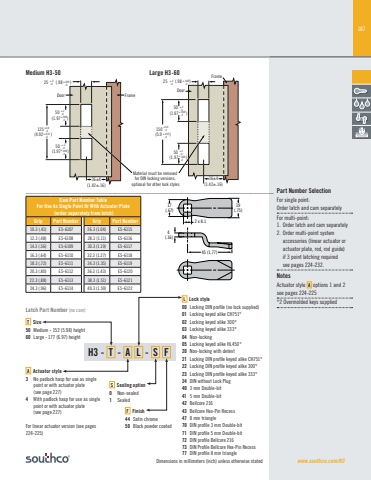 187Dimensions in millimeters (inch) unless otherwise stated www.southco.com/H3L Lock style00 Locking DIN profile (no lock supplied) 01 Locking keyed alike CH751*02 Locking keyed alike 300* 03 Locking keyed alike 333* 04 Non-locking05 Locking keyed alike HL450*20 Non-locking with detent21 Locking DIN profile keyed alike CH751*22 Locking DIN profile keyed alike 300* 23 Locking DIN profile keyed alike 333*24 DIN without Lock Plug40 3 mm Double-bit41 5 mm Double-bit42 Bellcore 21643 Bellcore Hex-Pin Recess47 8 mm triangle70 DIN profile 3 mm Double-bit71 DIN profile 5 mm Double-bit72 DIN profile Bellcore 21673 DIN Profile Bellcore Hex-Pin Recess77 DIN profile 8 mm triangleH3 - T - A L - S FT Size50 Medium - 152 (5.98) height60 Large - 177 (6.97) heightF Finish44 Satin chrome 50 Black powder coatedA Actuator style3 No padlock hasp for use as single point or with actuator plate (see page 227)4 With padlock hasp for use as single point or with actuator plate (see page 227) For linear actuator version (see pages 224-225) For single point:Order latch and cam separatelyFor multi-point:1. Order latch and cam separately2. Order multi-point systemaccessories (linear actuator or actuator plate, rod, rod guide) if 3 point latching requiredsee pages 224-232.NotesActuator style A options 1 and 2 see pages 224-225*2 Overmolded keys supplied150 (5.9 )25 (.98 )125 (4.92 )50 (1.97 )Material must be removed for DIN locking versions, optional for other lock styles+.2-0 +.008-0 25 (.98 ) +.2-0 +.008-0+.2-0+.008-050 (1.97 )+.2-0+.008-050 (1.97 )+.2-0+.008-050 (1.97 )+.2-0+.008-0+0.4-0+.016-0+0.4-0+.016-036±4(1.42±.16)36±4(1.42±.16)FrameDoor FrameDoorCam Part Number Table For Use As Single Point Or With Actuator Plate (order separately from latch)Grip Part Number Grip Part Number10.3 (.41) E5-6107 26.3 (1.04) E5-611512.3 (.48) E5-6108 28.3 (1.11) E5-611614.3 (.56) E5-6109 30.3 (1.19) E5-611716.3 (.64) E5-6110 32.3 (1.27) E5-611818.3 (.72) E5-6111 34.3 (1.35) E5-611920.3 (.80) E5-6112 36.3 (1.43) E5-612022.3 (.88) E5-6113 38.3 (1.51) E5-612124.3 (.96) E5-6114 40.3 (1.59) E5-612217(.67)2 x 8.14 (.16)45 (1.77)19(.75)Medium H3-50 Large H3-60S Sealing option0 Non-sealed1 SealedLatch Part Number (no cam)___________________________________________________________________________ Part Number Selection
