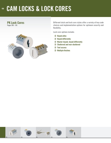 CAM LOCKS & LOCK CORES 188PK Lock Cores Pages 190 - 191PK PK PK PK PK Different latch and lock core styles offer a variety of key code choices and implementation options for optimum security and flexibility. Lock core options include: Keyed alike Keyed differently Master keyed, keyed differently Shuttered and non-shuttered Tool access Multiple finishes