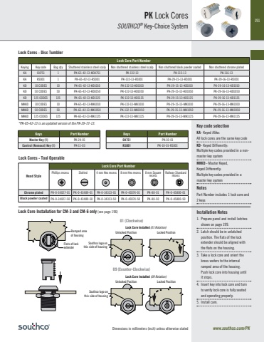 191Dimensions in millimeters (inch) unless otherwise statedInstallation Notes1. Prepare panel and install latches shown on page 199.2. Latch should be in unlatched position. The flats of the lock extender should be aligned with the flats on the housing.3. Take a lock core and orient the brass wafers to the internal ramped area of the housing. Push lock core into housing until it stops.4. Insert key into lock core and turn to verify lock core is fully seated and operating properly.5. Install cam.PK Lock CoresSOUTHCO® Key-Choice SystemLock Cores - Disc Tumbler*PK-65-42-13 is an updated version of the PK-39-72-13.Head StyleLock Core Part NumberPhillips recess Slotted 4 mm Hex recess 8 mm Hex recess 8 mm Square recess Railway Standard recessChrome plated PK-0-34027-01 PK-0-43489-01 PK-0-34323-01 PK-0-40374-01 PK-80-01 PK-0-45800-01Black powder coated PK-0-34027-50 PK-0-43489-50 PK-0-34323-50 PK-0-40374-50 PK-80-50 PK-0-45800-50Lock Cores - Tool OperableRamped area of housingFlats of lockextenderUnlocked Position Locked PositionLock Core Installed (01 Rotation)Locked PositionSouthco logo onthis side of housingSouthco logo onthis side of housingUnlocked PositionLock Core Installed (09 Rotation)Keys Part NumberMaster Key (1) PK-24-01Control (Removal) Key (1) PK-11-0309 (Counter-Clockwise)01 (Clockwise)Lock Core Part NumberKeying Key code Bag qty Shuttered stainless steel scalp Non shuttered stainless steel scalp Non shuttered black powder coated Non shuttered chrome platedKA CH751 1 PK-65-42-13-KCH751 PK-132-13 PK-115-13 PK-116-13KA RS001 1 PK-65-42-13-RS001 PK-132-13-RS001 PK-29-15-13-RS001 PK-29-16-13-RS001KD 10 CODES 10 PK-65-42-13-KD1010 PK-132-13-KD1010 PK-29-15-13-KD1010 PK-29-16-13-KD1010KD 50 CODES 50 PK-65-42-13-KD1050 PK-132-13-KD1050 PK-29-15-13-KD1050 PK-29-16-13-KD1050KD 125 CODES 125 PK-65-42-13-KD1125 PK-132-13-KD1125 PK-29-15-13-KD1125 PK-29-16-13-KD1125MKKD 10 CODES 10 PK-65-42-13-MK1010 PK-132-13-MK1010 PK-29-15-13-MK1010 PK-29-16-13-MK1010MKKD 50 CODES 50 PK-65-42-13-MK1050 PK-132-13-MK1050 PK-29-15-13-MK1050 PK-29-16-13-MK1050MKKD 125 CODES 125 PK-65-42-13-MK1125 PK-132-13-MK1125 PK-29-15-13-MK1125 PK-29-16-13-MK1125Key code selectionKA- Keyed Alike: All lock cores are the same key codeKD- Keyed Differently: Multiple key codes provided in a nonmaster key systemMKKD - Master Keyed, Keyed Differently: Multiple key codes provided in a master key systemNotesPart Number includes 1 lock core and 2 keysLock Core Installation for CM-3 and CM-6 only (see page 196) www.southco.com/PKKeys Part NumberCH751 PK-10-01RS001 PK-10-01-RS001