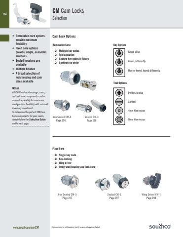 194Dimensions in millimeters (inch) unless otherwise stated194Removable Core Key OptionsTool OptionsFixed CoreNon Sealed CM-6 Sealed CM-3 Page 196 Page 196Non Sealed CM-5 Sealed CM-2 Wing Driver CM-1Page 197 Page 197 Page 198 Multiple key codes Tool actuation Change key codes in future Configure to order Single key code Key-locking Wing driver Integrated housing and lock corewww.southco.com/CMKeyed alikeKeyed differentlyMaster keyed, keyed differentlyPhillips recessSlotted4mm Hex recess8mm Hex recessCam Lock OptionsCM Cam LocksSelection• Removable core options provide maximum flexibility • Fixed core options provide simple, economic solutions• Sealed housings are available • Multiple finishes • A broad selection of lock housing and cam sizes availableNotesAll CM Cam Lock housings, cams, and lock core components can be ordered separately for maximum configuration flexibility with minimal inventory investment.To determine the perfect CM Cam Lock components for your needs, simply follow the Selection Guideon the next page.