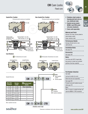 197Dimensions in millimeters (inch) unless otherwise statedMax. Door ThicknessHousing LengthH Housing Length Number2.4 (.09) 11 (.438) 7 Non-Sealed Only7.1 (.28) 16 (.625) 113.5 (.53) 22 (.875) 219.8 (.78) 28.5 (1.125) 626.2 (1.03) 35 (1.375) 332.5 (1.28) 41 (1.625) 438.9 (1.53) 48 (1.875) 5R Rotation01 Clockwise09 Counter-clockwiseF FinishB Black powder coated CM - 2 - H F 1 R - 2SB C Chrome platedCM - 5 - H S4 R - 2TBACTUALSIZEUnlocked Position Locked PositionUnlocked Position Locked PositionR 01 (Clockwise to Lock) R 09 (Counter-Clockwise to Lock) Unlocked Position Locked PositionUnlocked Position Locked PositionCam Rotationwww.southco.com/CM• Stainless steel scalp on housing and lock core on non-shuttered style• Sealed version meets NEMA 4 and IP65 water intrusion standards• Cams sold separatelyMaterial and FinishHousing: Zinc alloy, chrome plated or black powder coatedScalp: stainless steelPerformance DetailsAverage ultimate load on cam: 180 N (40 lbf)Installation NotesSee page 199AccessoriesSee pages 169NotesLock: Key code CH751, keyed alike, key removal in locked and unlocked positions (two keys supplied)Lock part number (no cam)Order lock and cam separatelyCam page 199To select cam part number see grip table page 195NotesCM-2-1 version is sealed but does not meet the NEMA 4 / IP65 standardsCM Cam LocksFixed coreDoorFrameØ 22 (.86)7 (.28)Housing length 1: 6.3 (.25)Other housings: 4.5 (.18)Housing length 7: 7.1 (.28)Cam gripCam forwardStraight camCam reversedH Housing length DoorFrameØ 22 (.86)7 (.28)O-RingSealing washercompressed height0.5 (.02)Housing length 1: 6.3 (.25)Other housings: 4.5 (.18)Cam gripCam forwardStraight camCam reversedH Housing length Sealed Disc Tumbler Non-Sealed Disc TumblerNon-sealed versionSealed Version(Stainless steel scalp)Pictured with Lockcore Installed Pictured with Lockcore Installed___________________________________________________________________________ Part Number SelectionSee table