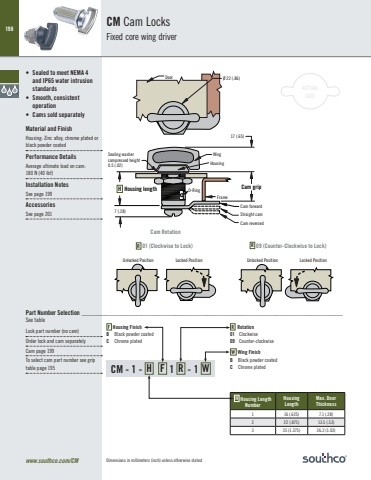 198Dimensions in millimeters (inch) unless otherwise statedACTUALSIZEUnlocked Position Locked PositionUnlocked Position Locked PositionR 01 (Clockwise to Lock) R 09 (Counter-Clockwise to Lock) Unlocked Position Locked PositionUnlocked Position Locked PositionCam Rotationwww.southco.com/CMLock part number (no cam)Order lock and cam separatelyCam page 199To select cam part number see grip table page 195CM Cam LocksFixed core wing driverO-RingDoorFrameCam grip17 (.65)Ø 22 (.86)7 (.28)Sealing washercompressed height0.5 (.02)Cam forwardStraight camCam reversedWingHousingH Housing length• Sealed to meet NEMA 4 and IP65 water intrusion standards• Smooth, consistent operation• Cams sold separatelyMaterial and FinishHousing: Zinc alloy, chrome plated or black powder coatedPerformance DetailsAverage ultimate load on cam: 180 N (40 lbf) Installation NotesSee page 199AccessoriesSee page 201H Housing Length NumberHousing LengthMax. Door Thickness1 16 (.625) 7.1 (.28)2 22 (.875) 13.5 (.53)3 35 (1.375) 26.2 (1.03)CM - 1 - H F 1 R - 1 WR Rotation01 Clockwise09 Counter-clockwiseW Wing FinishB Black powder coated C Chrome platedF Housing FinishB Black powder coated C Chrome platedPart Number Selection _______________________________________________________________________________See table