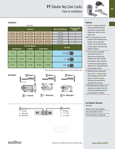 203Dimensions in millimeters (inch) unless otherwise stated www.southco.com/PTPT Tubular Key Cam LocksCams & installationPT - S C 09 Installation Material1. In the TAN section, locate the cam grip calculated for yourapplication. If your grip fallsbetween two values, use thehigher value.Notes: For cam grips that can beachieved with multiple housinglengths, use the value thatresults in the shortest housingpossible based on the Max. door thickness allowed.2. From this value, move right horizontally into the Gray section and verify your door thickness falls within the Max. door thickness listed. Once this is verified, the housing length is selected and is illustrated by the housing length number.3. Returning to your original gripvalue in the TAN section, movedown vertically into the GREENsection. The GREEN sectionillustrates the cams that areappropriate for your grip.4. By determining the required camorientation and style in the BLUEsection, the appropriate cam foryour application is selected.Cam Grip Max. Door Thickness Housing Length Number19.0 (.75) 15.9 (.63) 12.7 (.50) 9.5 (.38) 6.4 (.25) 5.1 (.20) 123.8 (.94) 20.7 (.81) 17.5 (.69) 14.3 (.56) 11.2 (.44) 10.9 (.43) 230.1 (1.19) 27 (1.06) 23.8 (.94) 20.6 (.81) 17.5 (.69) 15.9 (.63) 336.8 (1.45) 33.7 (1.33) 30.5 (1.20) 27.3 (1.08) 24.2 (.95) 22.9 (.90) 442.8 (1.69) 39.7 (1.56) 36.5 (1.44) 33.3 (1.31) 30.2 (1.19) 28.9 (1.14) 5Cam Part NumberCam Type Cam Reversed Straight Cam ForwardPT-T409 PT-T209 PT-T009 PT-T209 PT-T409 No HookPT-W409 PT-W209 PT-F009 PT-F209 PT-F409 LeftPT-F409 PT-F209 PT-F009 PT-W209 PT-W409 RightACTUALSIZE28.6(1.13)28.6 (1.13)19 (.75) 28.6 (1.13)S T - No hook S F - Hook type 1 S W - Hook type 23 (.12)Cam Styles C Offset C Offset C OffsetS Cam StyleT No hookF Hook type 1W Hook type 2C Cam Offset0 No offset2 3.2 (.125)4 6.4 (.250)Also use the online configurator at www.southco.comStandard28.6(1.13)28.6 (1.13)19 (.75) 28.6 (1.13)S T - No hook S F - Hook type 1 S W - Hook type 23 (.12)C Offset C Offset C Offset___________________________________________________________________________ Part Number SelectionSee tableOrder lock and cam separatelyCam part number (no lock)For Lock selection see page 202