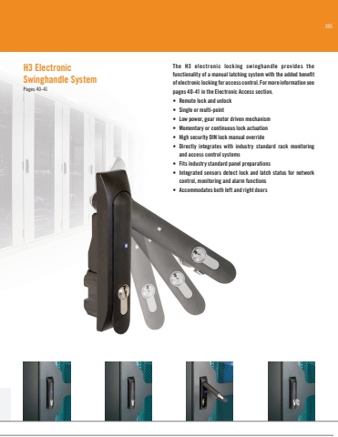 205The H3 electronic locking swinghandle provides the functionality of a manual latching system with the added benefit of electronic locking for access control. For more information see pages 40-41 in the Electronic Access section.• Remote lock and unlock• Single or multi-point • Low power, gear motor driven mechanism• Momentary or continuous lock actuation• High security DIN lock manual override• Directly integrates with industry standard rack monitoring and access control systems• Fits industry standard panel preparations • Integrated sensors detect lock and latch status for network control, monitoring and alarm functions• Accommodates both left and right doorsH3 Electronic Swinghandle SystemPages 40-41