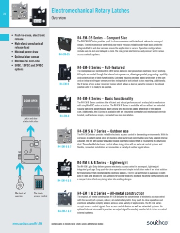 20Dimensions in millimeters (inch) unless otherwise statedR4-EM-9 Series – Full-featuredThe microprocessor controlled R4-EM 9 Series delivers next generation electronic rotary latching. All inputs are routed through the internal microprocessor, allowing expanded programing capability and customization of latch functionality. Extended housing provides added protection of the cam and an integrated trigger sensor provides indisputable lock/unlock status reporting. Additionally, the 9 Series offers a door retention feature which allows a door or panel to remain in the closed position until it is ready to be opened. R4-EM 4 & 6 Series – LightweightThe R4-EM Light Duty delivers proven electronic access control in a compact, lightweight integrated package. Easy push-to-close operation and simple installation make it an ideal solution for transitioning from mechanical to electronic access. The R4-EM Light Duty is available in both auto re-lock and delayed re-lock versions for added fl exibility. Multiple mounting confi gurations and a compact size afford easy integration into existing designs. R4-EM 5 & 7 Series – Outdoor useThe R4-EM Outdoor provides reliable electronic access control in demanding environments. With its corrosion-resistant plated-steel or stainless steel outer body construction and fully-sealed internal actuator, the R4-EM Outdoor provides reliable electronic locking that is resistant to moisture and dust. The embedded electronic control allows integration with an external control system and fl exible, concealed installation accommodates a variety of outdoor applications.R4-EM 1 & 2 Series – All-metal construction The original, all-metal construction R4-EM delivers the convenience of electronic access control with the security of a proven, robust, all-metal rotary latch. Easy push-to-close operation and electronic actuation simplify access across a wide variety of applications. The R4-EM series accepts access control signals from access control devices as well as networked systems. An optional internal microswitch provides an output signal to remotely monitor latch status or control external systems.R4-EM-8 Series – Basic functionalityThe R4-EM 8 Series combines the effi cient and robust performance of a rotary latch mechanism with simplifi ed DC motor actuation. The R4-EM 8 Series is available with or without an extended housing option to accommodate door sensing and to provide added protection of the locking cam. Additionally, the 8 Series is available with an integrated connector and mechanical override bracket, and features simple, concealed two-hole installation. • Push-to-close, electronic release• High electromechanical release load • Minimal power draw• Optional door sensor• Mechanical over-ride• 5VDC, 12VDC and 24VDC optionsDOOR OPEN1 2 34 5 67 8 9 0 #1 2 34 5 67 8 9Ø 0 #OPEN LATCHR4-EM-9R4-EM-8R4-EM-5 & 7R4-EM-1 & 2R4-EM-4 & 6Electromechanical Rotary LatchesOverviewMechanical overrideLatch and door status indicationElectronic access controlwww.southco.com/R4-EMR4-EM-05 Series – Compact SizeThe R4-EM-05 Series provides push to close convenience with electronic release in a compact design. The microprocessor controlled gear motor releases reliably under high loads while the integrated latch and door sensors ensure the application is secure. Operation confi gurations include auto re-lock and delayed re-lock. The integrated electronics easily connect with various R4-EM-05 access controls systems.