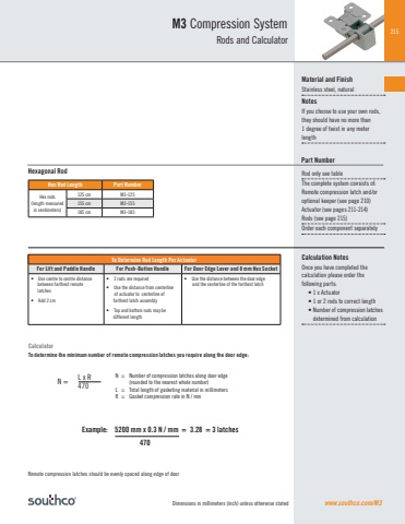 215Hex Rod Length Part NumberHex rods(length measured in centimeters)125 cm M3-125155 cm M3-155185 cm M3-185Dimensions in millimeters (inch) unless otherwise stated www.southco.com/M3L x R470M3 Compression SystemRods and CalculatorMaterial and FinishStainless steel, natural NotesIf you choose to use your own rods, they should have no more than 1 degree of twist in any meter lengthCalculation NotesOnce you have completed the calculation please order the following parts:• 1 x Actuator• 1 or 2 rods to correct length• Number of compression latches determined from calculationRemote compression latches should be evenly spaced along edge of doorCalculatorTo determine the minimum number of remote compression latches you require along the door edge:Hexagonal RodExample: 5200 mm x 0.3 N / mm = 3.28 = 3 latches 470N = Number of compression latches along door edge (rounded to the nearest whole number)L = Total length of gasketing material in millimeters R = Gasket compression rate in N / mmN = Rod only see tableThe complete system consists of: Remote compression latch and/or optional keeper (see page 210)Actuator (see pages 211-214)Rods (see page 215)Order each component separatelyPart NumberTo Determine Rod Length Per ActuatorFor Lift and Paddle Handle For Push-Button Handle For Door Edge Lever and 8 mm Hex Socket• Use centre to centre distance between farthest remote latches• Add 2 cm• 2 rods are required• Use the distance from centerline of actuator to centerline of farthest latch assembly• Top and bottom rods may be different length• Use the distance between the door edge and the centerline of the farthest latch