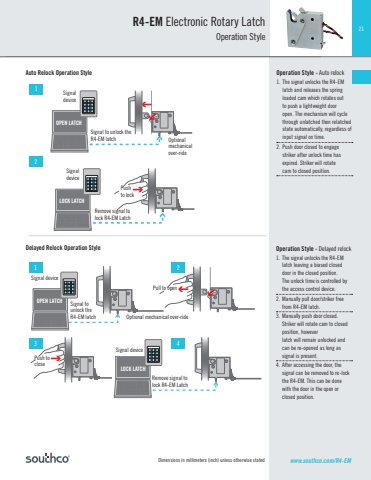 21Dimensions in millimeters (inch) unless otherwise statedAuto Relock Operation StyleDelayed Relock Operation StyleOperation Style - Auto relock1. The signal unlocks the R4-EM latch and releases the spring loaded cam which rotates out to push a lightweight door open. The mechanism will cycle through unlatched then relatched state automatically, regardless of input signal on time.2. Push door closed to engage striker after unlock time has expired. Striker will rotate cam to closed position.Signal to unlock the R4-EM latchSignal to unlock the R4-EM latchOptional mechanical over-rideRemove signal to lock R4-EM LatchPush to closePush to lockPull to openOptional mechanical over-rideOPEN LATCHOPEN LATCHLOCK LATCH1 2 34 5 67 8 9 0 #1 2 34 5 67 8 9 0 #1 2 34 5 67 8 9 0 #Signal deviceSignal deviceSignal deviceRemove signal to lock R4-EM Latch1 2 34 5 67 8 9 0 #Signal deviceLOCK LATCHSignal to unlock the R4-EM latchSignal to unlock the R4-EM latchOptional mechanical over-rideRemove signal to lock R4-EM LatchPush to closePush to lockPull to openOptional mechanical over-rideOPEN LATCHOPEN LATCHLOCK LATCH1 2 34 5 67 8 9 0 #1 2 34 5 67 8 9 0 #1 2 34 5 67 8 9 0 #Signal deviceSignal deviceSignal deviceRemove signal to lock R4-EM Latch1 2 34 5 67 8 9 0 #Signal deviceLOCK LATCH131224R4-EM Electronic Rotary LatchOperation StyleOperation Style - Delayed relock1. The signal unlocks the R4-EM latch leaving a biased closed door in the closed position. The unlock time is controlled by the access control device.2. Manually pull door/striker free from R4-EM latch.3. Manually push door closed. Striker will rotate cam to closed position, however latch will remain unlocked and can be re-opened as long as signal is present.4. After accessing the door, the signal can be removed to re-lock the R4-EM. This can be done with the door in the open or closed position.www.southco.com/R4-EM