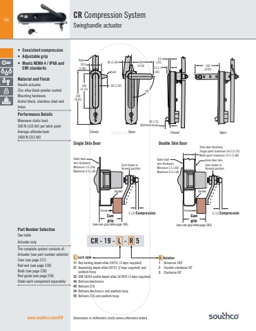 216ACTUAL SIZEwww.southco.com/CR146 50 (1.97)(5.75)229(9.01)50.5(1.99)Rod 90(3.54)36 (1.42)90˚11.5(.45)5.5(.22)102(4.02)Closed18 (.71)(Optional hasp)CamOpen Closed OpenCamgrip(see cam grip table page 185)5 (.2) CompressionInner door skin Cam shown in forward positionFrameGasketTotal door thicknessSingle point maximum 54.5 (2.15)Multi-point maximum 37.5 (1.48)Outer door skin thickness Minimum 1.5 (.06)Maximum 4.5 (.18)Camgrip(see cam grip table page 185)5 (.2) CompressionCam shown in forward positionFrameOuter door skin thickness Minimum 1.5 (.06)Maximum 4.5 (.18)GasketDimensions in millimeters (inch) unless otherwise statedCR Compression SystemSwinghandle actuatorCR - 19 - L - R 5L Lock style11 Key-locking keyed alike CH751 (2 keys supplied)21 Keylocking keyed alike CH751 (2 keys supplied) and padlock hasp32 DIN 18354 profile keyed alike 347876 (3 keys supplied)44 Bellcore electronics45 Bellcore 21654 Bellcore electronics and padlock hasp55 Bellcore 216 and padlock haspR Rotation1 Universal 180˚2 Counter-clockwise 90˚3 Clockwise 90˚Actuator onlyThe complete system consists of: Actuator (see part number selector)Cam (see page 217)Rod end (see page 218)Rods (see page 218)Rod guide (see page 218)Order each component separatelySingle Skin Door• Consistent compression• Adjustable grip• Meets NEMA 4 / IP66 and EMI standardsMaterial and FinishHandle actuator:Zinc alloy black powder coatedMounting hardware:Acetal black, stainless steel and brassPerformance DetailsMaximum static load: 500 N (110 lbf) per latch point Average ultimate load: 1400 N (315 lbf)Double Skin DoorPart Number SelectionSee table